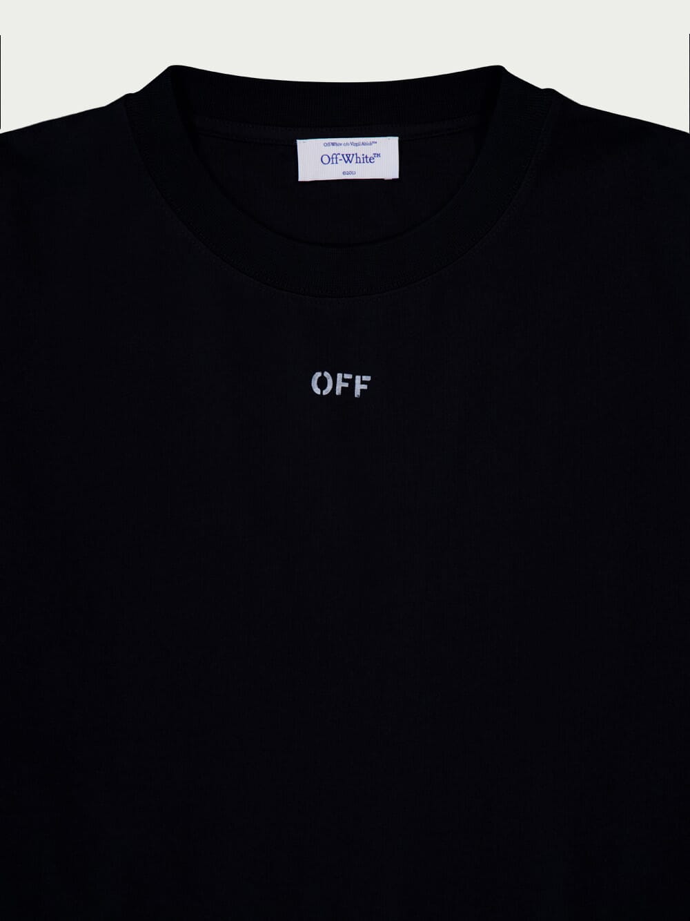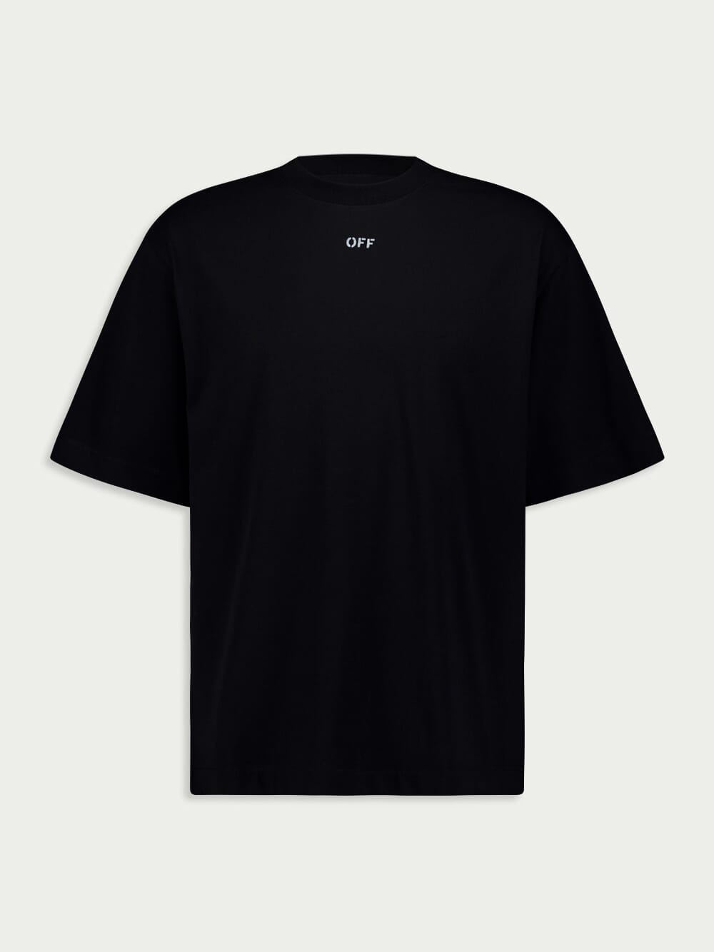 Off Stamp Skate T-Shirt. This black short-sleeved tee boasts a bold white OFF script on the front, capturing attention effortlessly. Crafted with a comfortable crewneck collar and tailored in a skate fit, it seamlessly blends style and comfort. Make a statement with every step and embrace urban fashion at its finest.