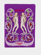 This iconic clutch features a hand-embroidered silk thread and felt appliqué design, inspired by John Milton's "Paradise Lost." Crafted with a stainless steel frame and a unique printed lining, each piece is a limited edition, handmade and hand sewn in Portugal. Due to its handcrafted nature, each bag is one of a kind with slight variations.