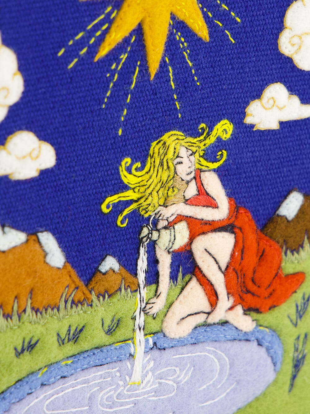 Embodying hope, renewal, and celestial beauty, The Star Tarot Clutch by Olympia Le-Tan channels the luminous energy of The Star tarot card. Handcrafted in Portugal, this clutch is adorned with intricate hand-embroidery and felt appliqué, capturing the ethereal imagery of stars, light, and destiny. The cotton-wool blend exterior features delicate motifs, while the stainless steel frame adds a modern touch of elegance. Each piece is a limited edition, individually numbered, and comes with a unique printed lining, ensuring that no two are the same. This clutch is a collector’s treasure, evoking a sense of magic and infinite possibilities.