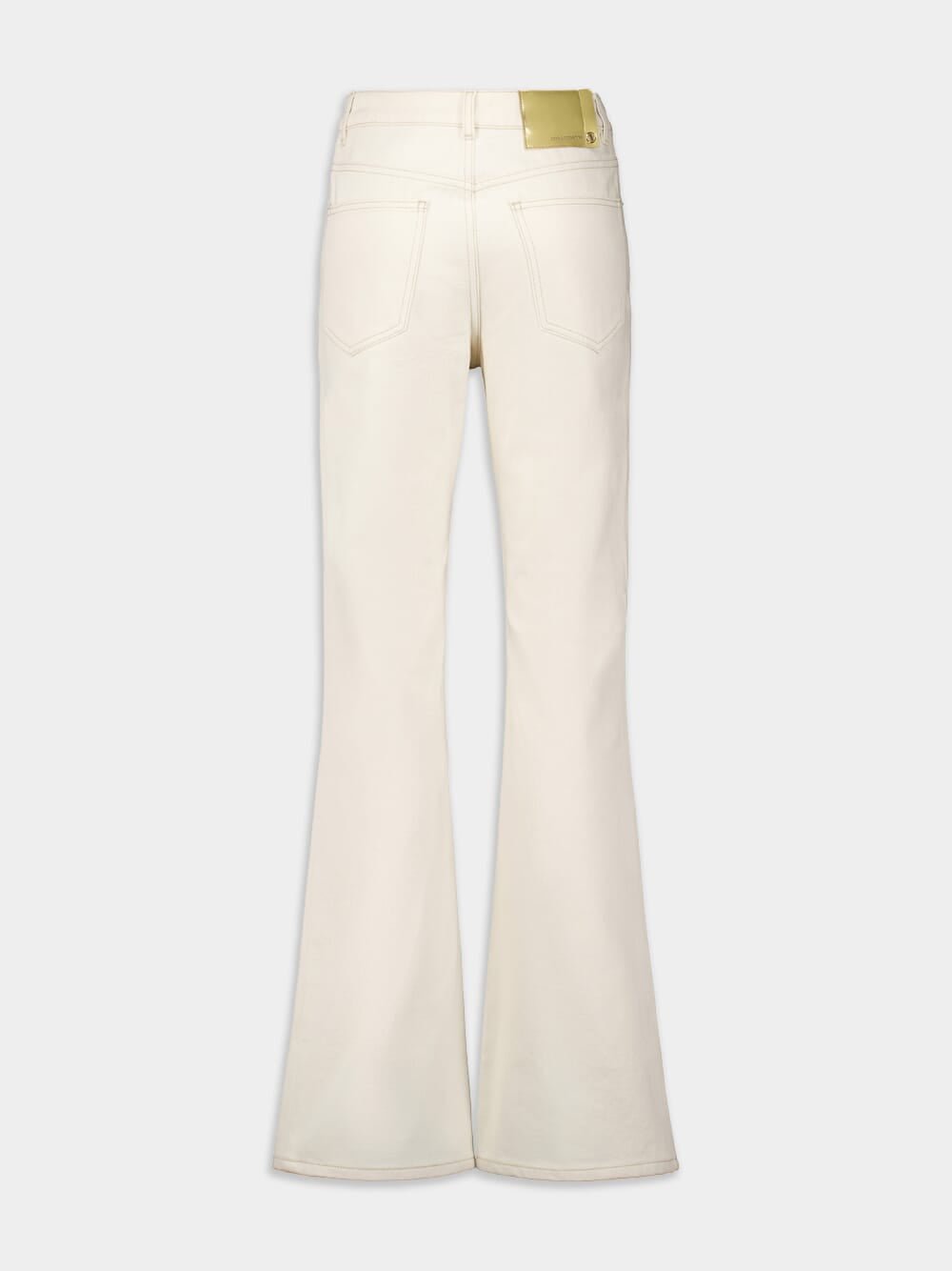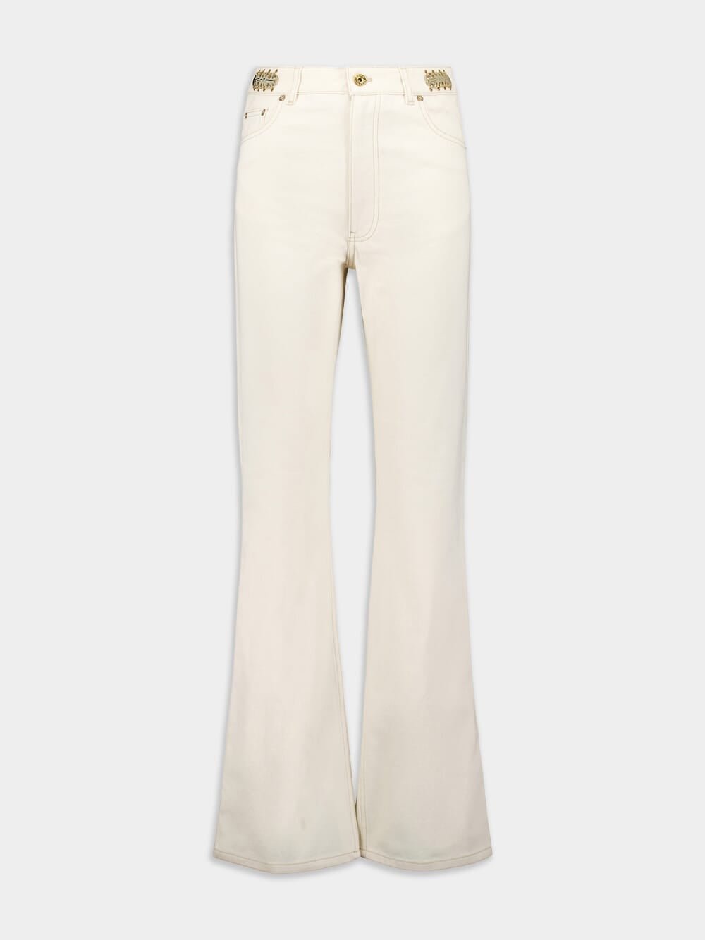 Denim flare jeans with iconic 1969 pastilles assembly detail at the waist designed to elevate your style with their impeccable charm and modern sophistication. These high-waisted trousers feature a front button and zip fastening for easy wear, while the belt loops allow you to accessorize and personalize your look. Adorned with exquisite disc detailing, these trousers effortlessly blend contemporary flair with timeless elegance.