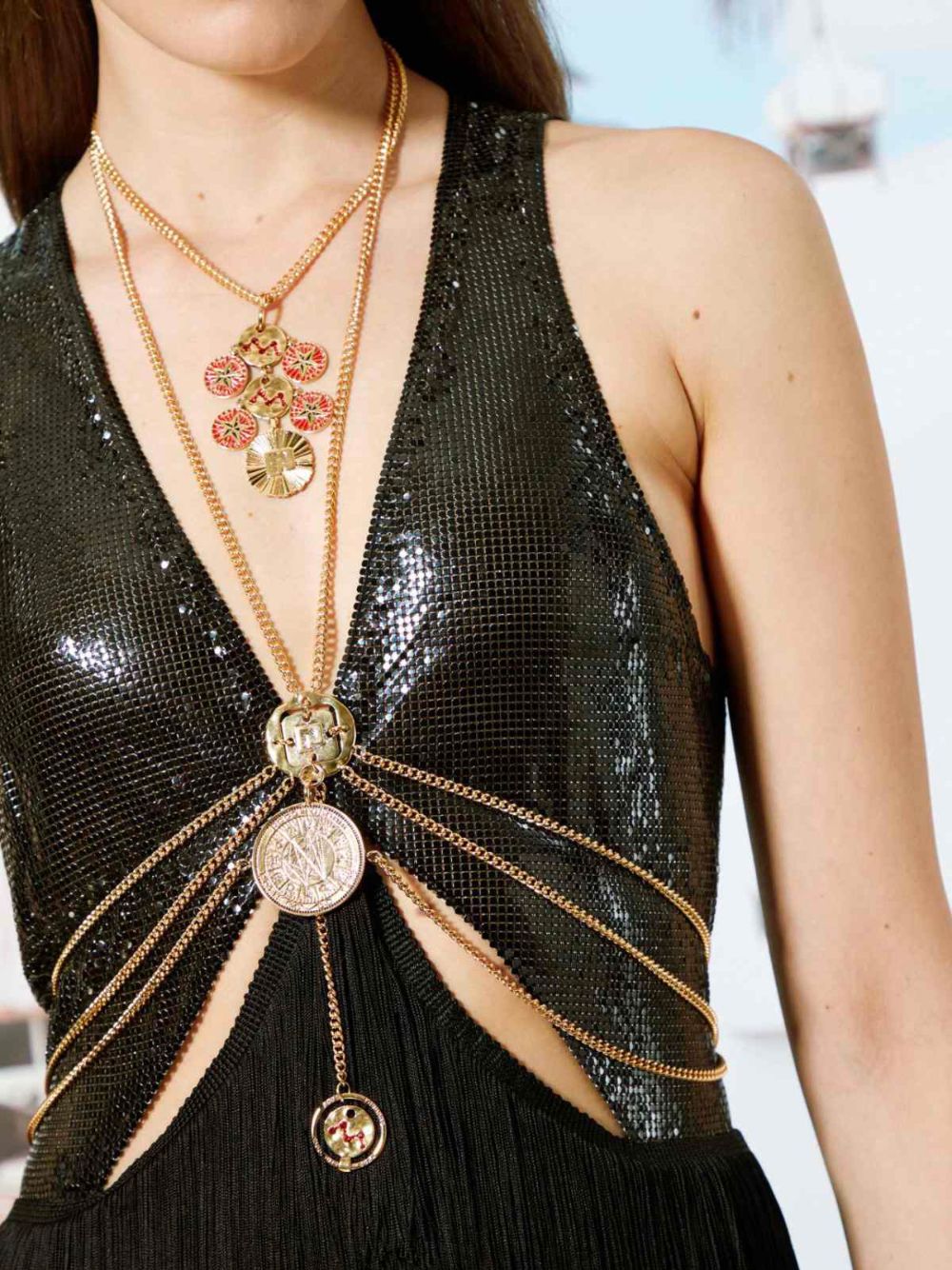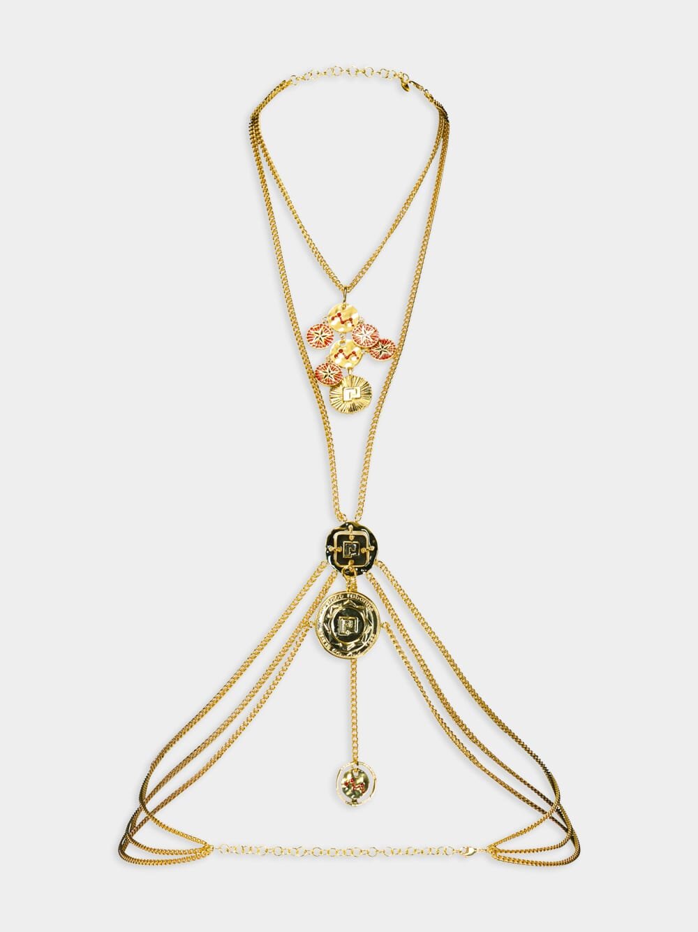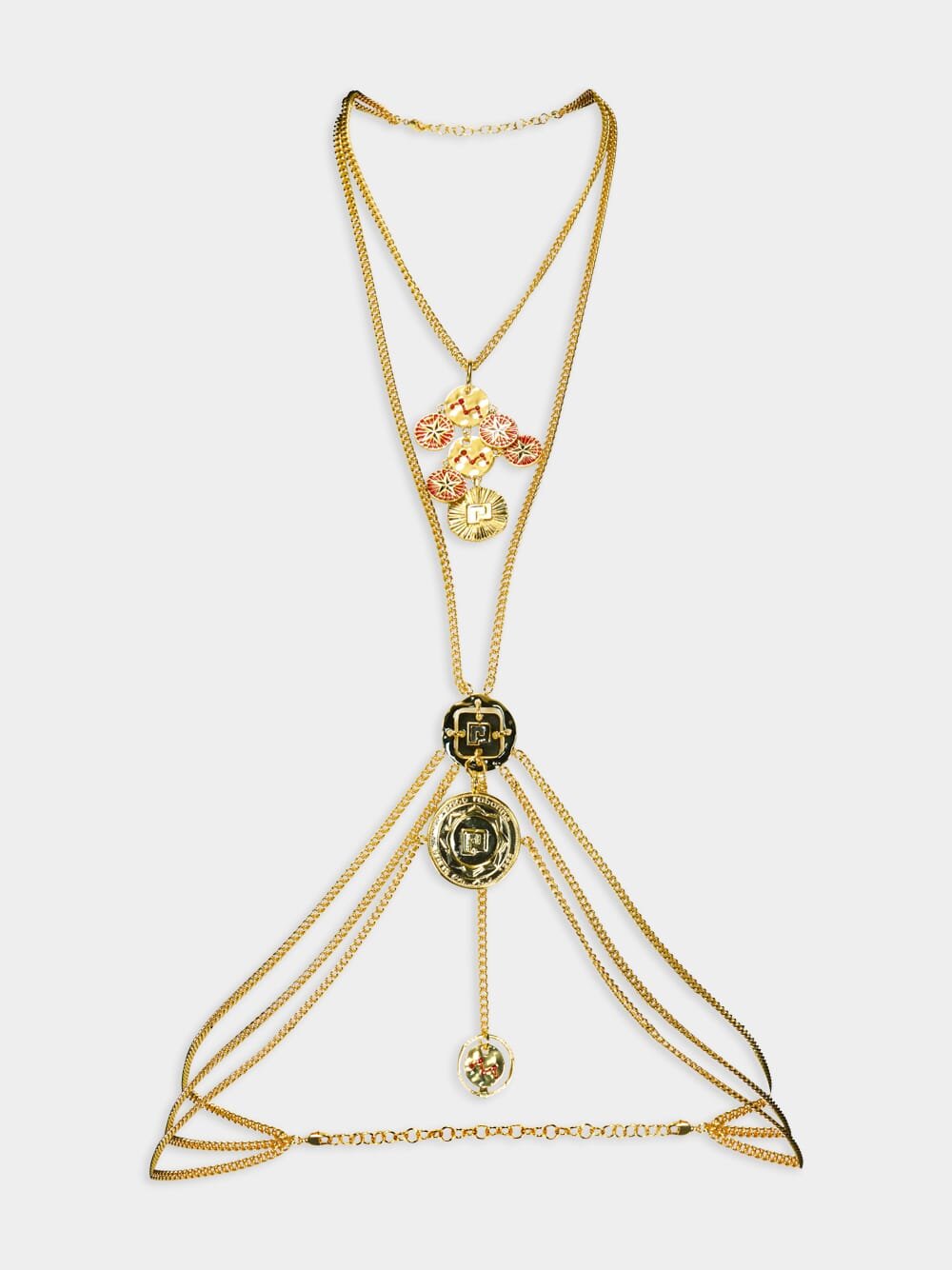Embellished body chain, a dazzling accessory that combines golden embellishments and intricate chains. This body chain is a true statement piece, designed to adorn and enhance your ensemble.