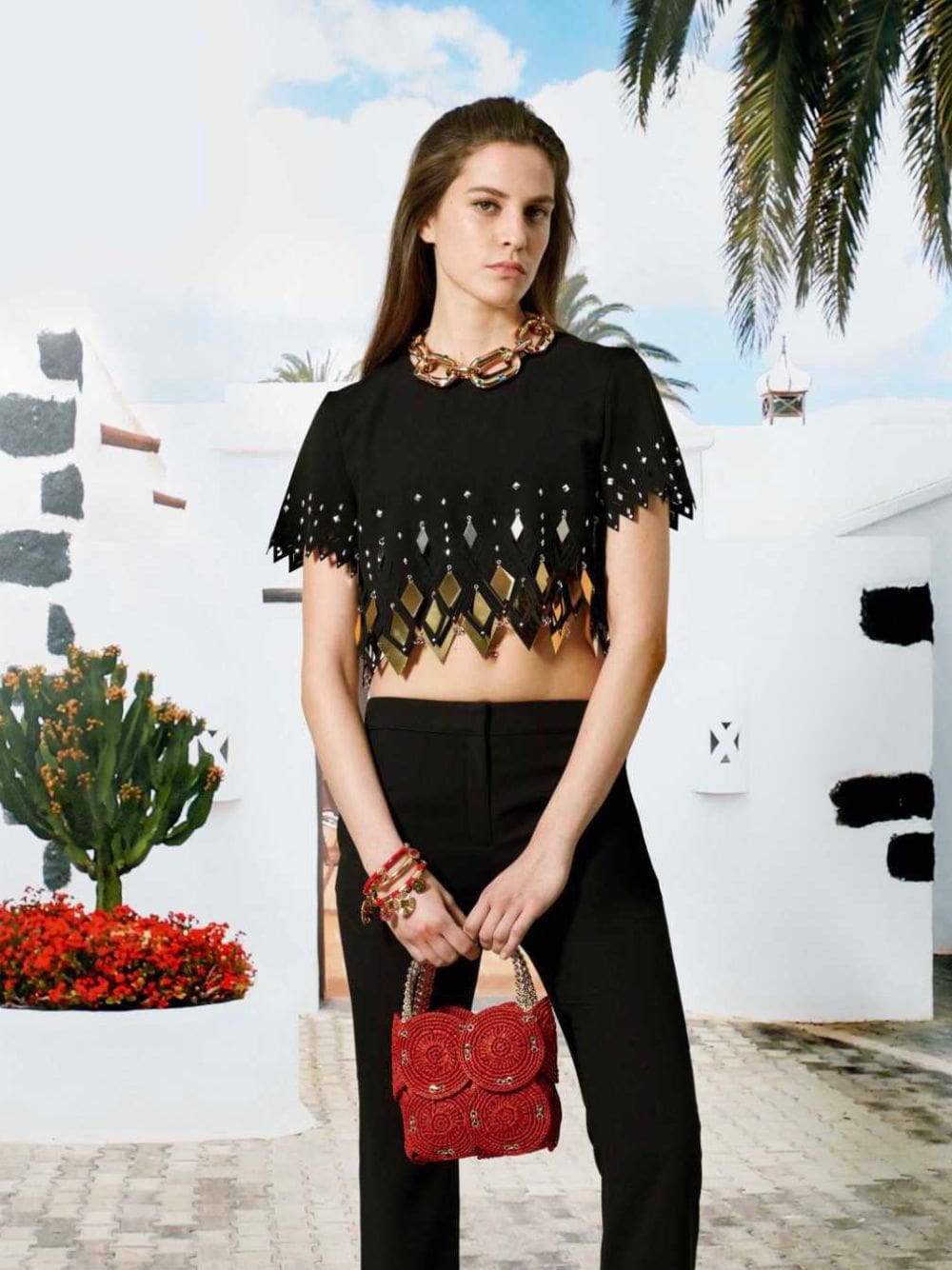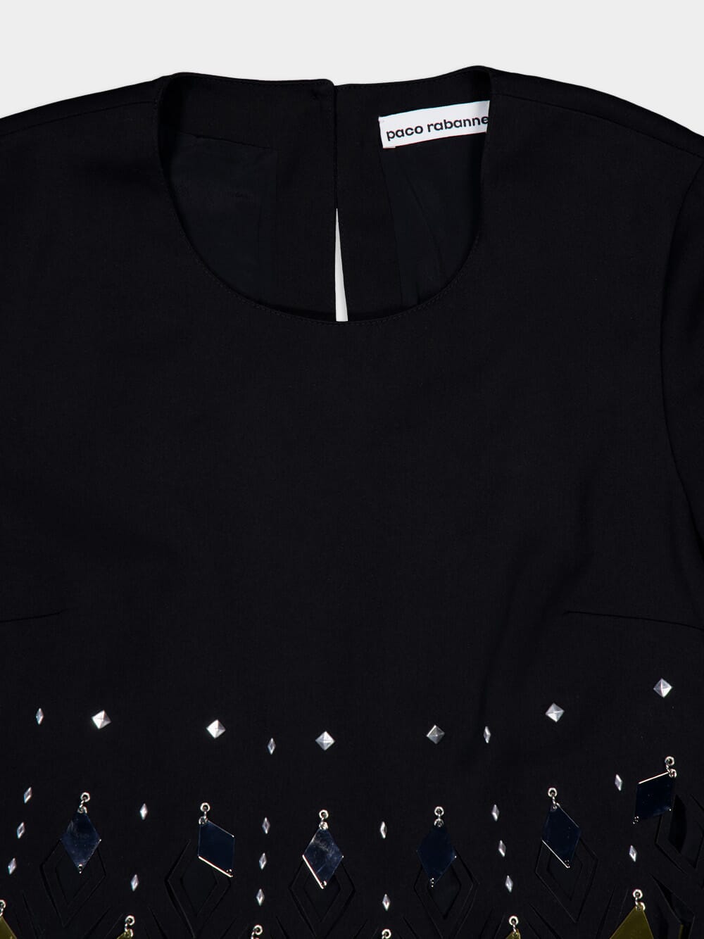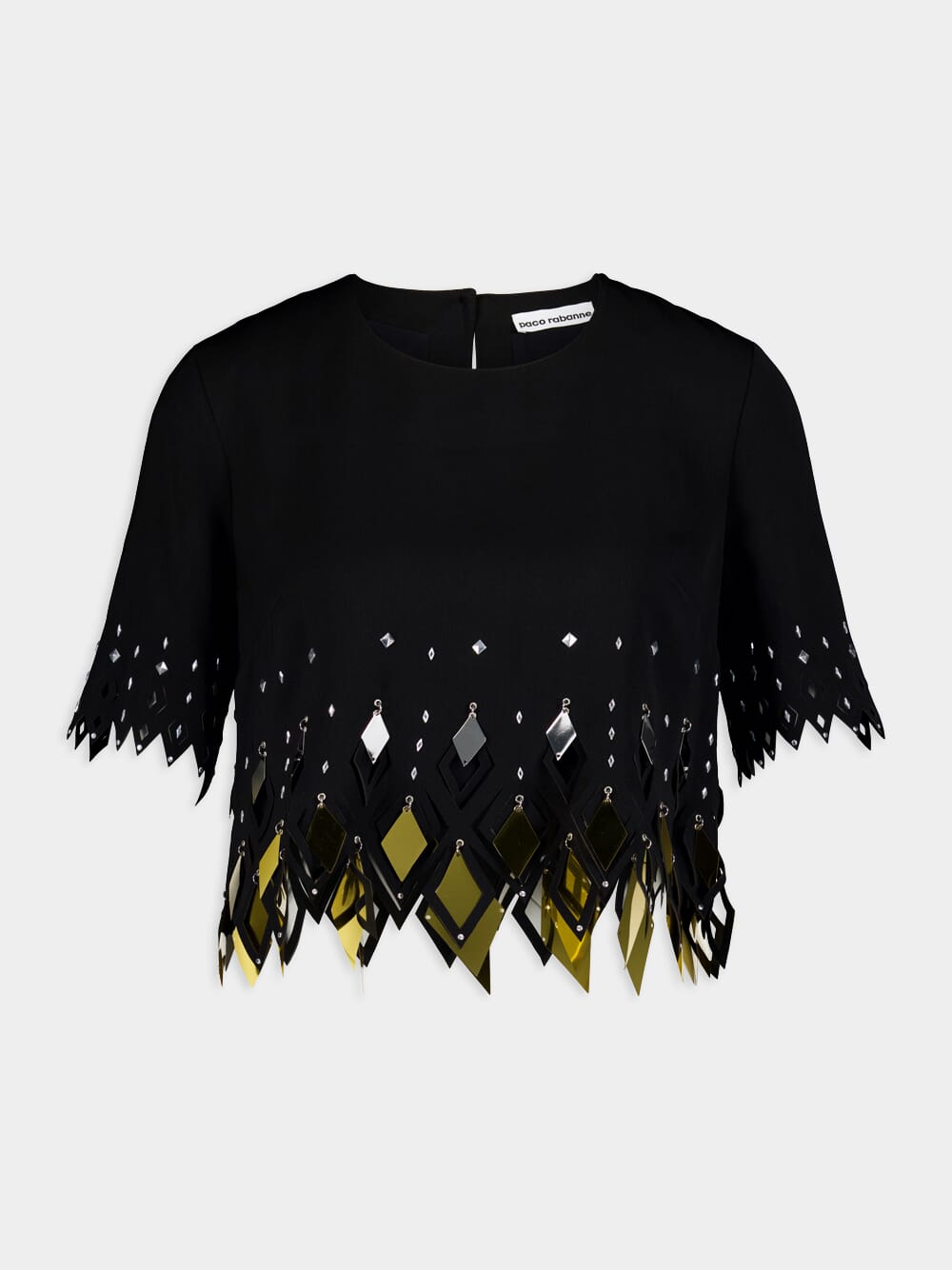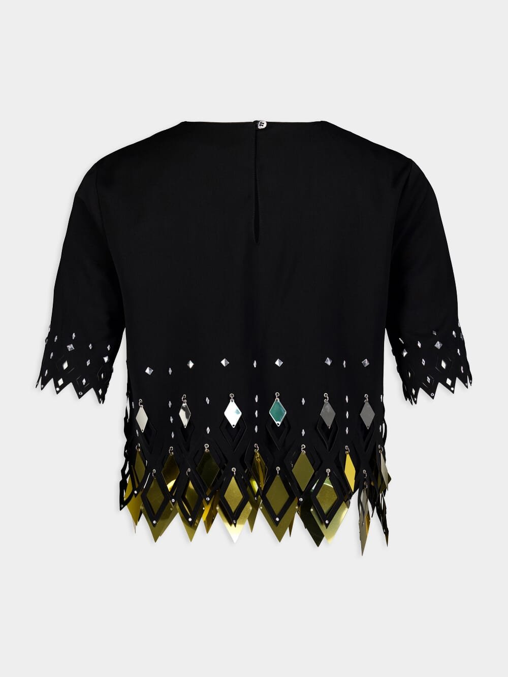 Black crop top crafted with meticulous attention to detail, this enchanting garment features a short-sleeve construction and laser-cut diamond-shaped slashes, giving to this top a luxurious and unexpected touch. The cropped length adds a trendy touch, allowing you to showcase your impeccable fashion sense.