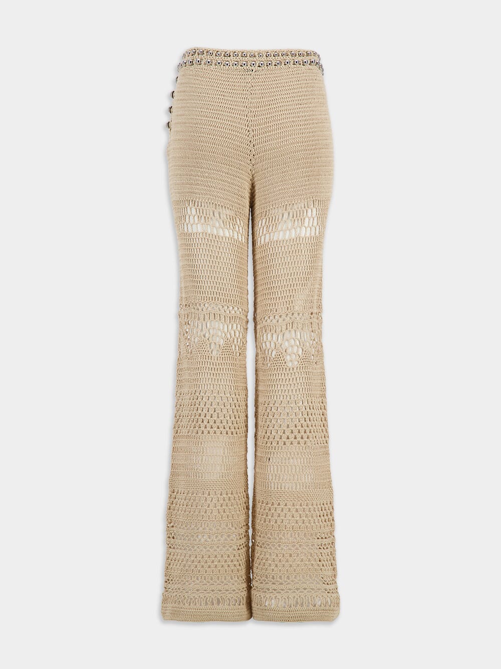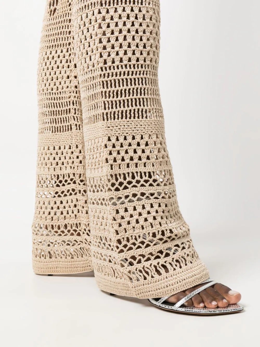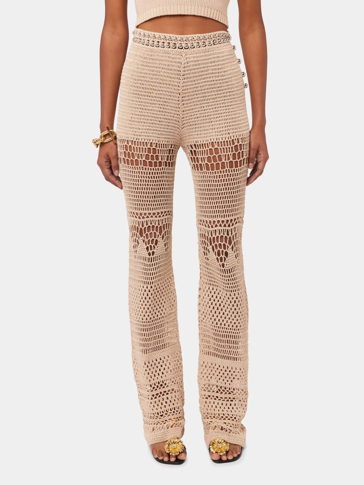 Feature a flattering high waist that accentuates your curves and offers a chic, on-trend look. With a flared leg design, they provide a sleek and sophisticated silhouette that's both versatile and flattering. These trousers are handmade, boast a crochet construction that ensures optimal comfort and a cozy feel. Whether you dress them up or down, these Rabanne's trousers are a versatile wardrobe staple that effortlessly combines fashion and comfort.