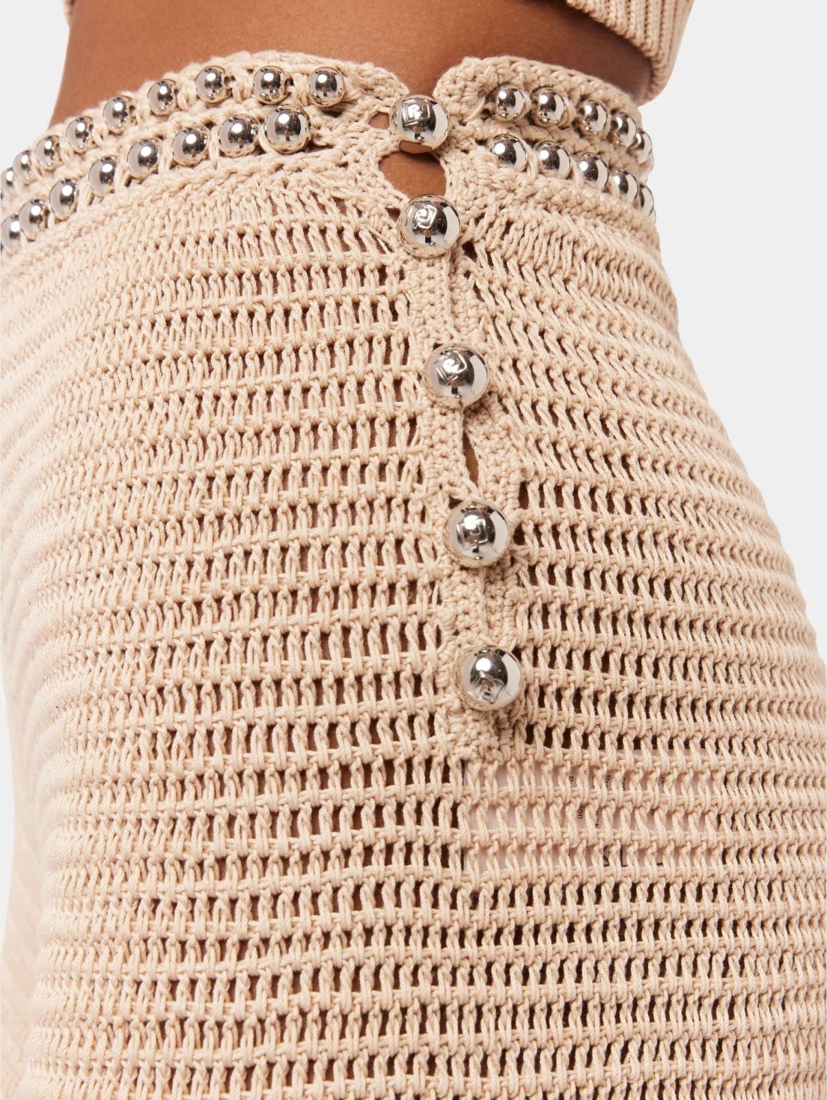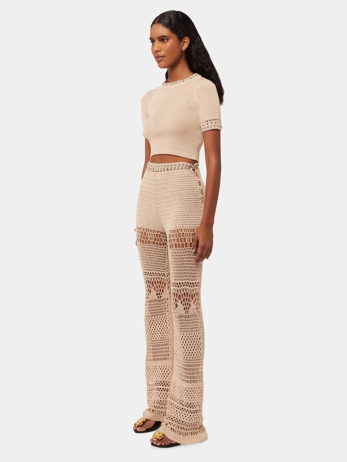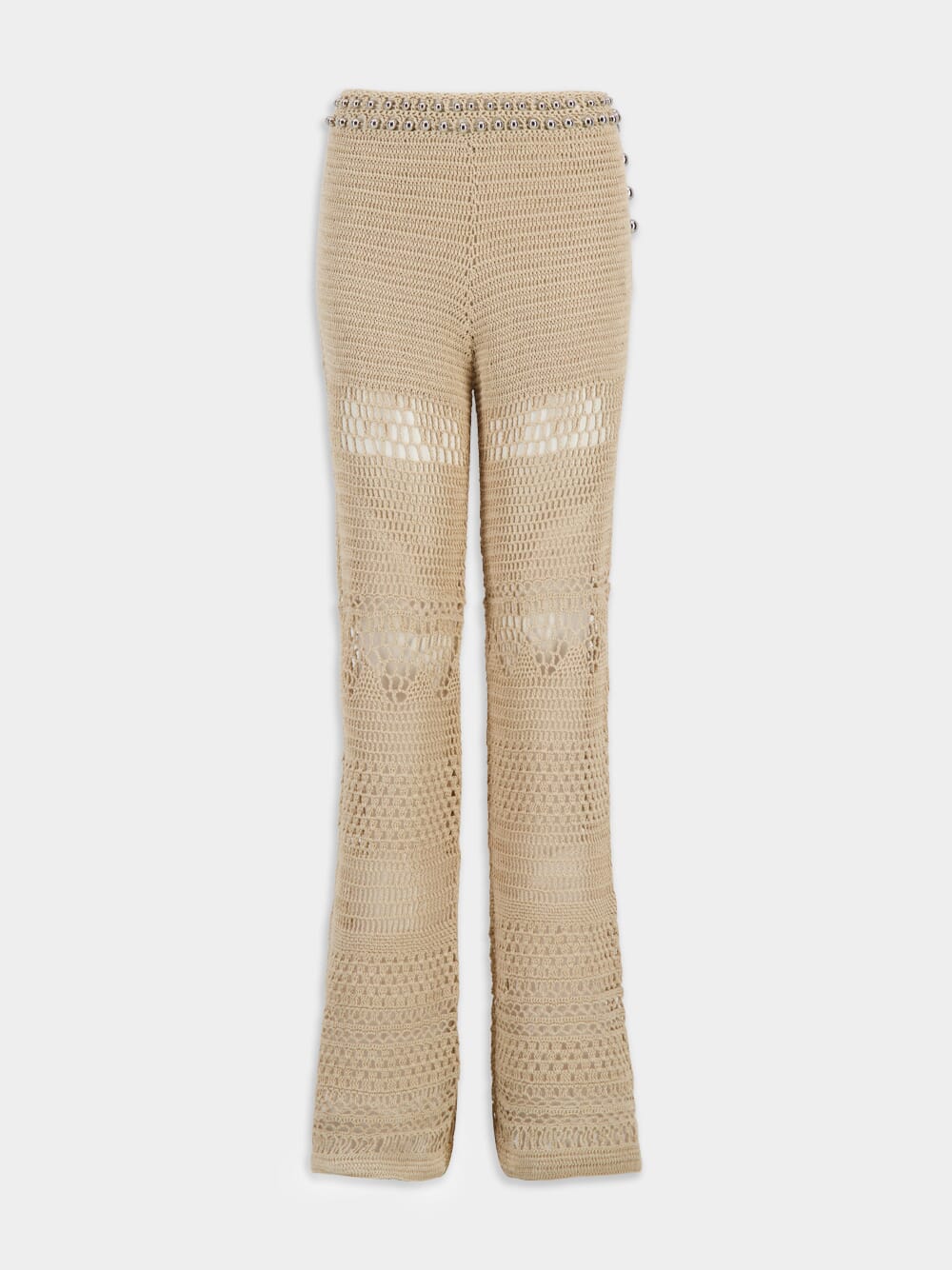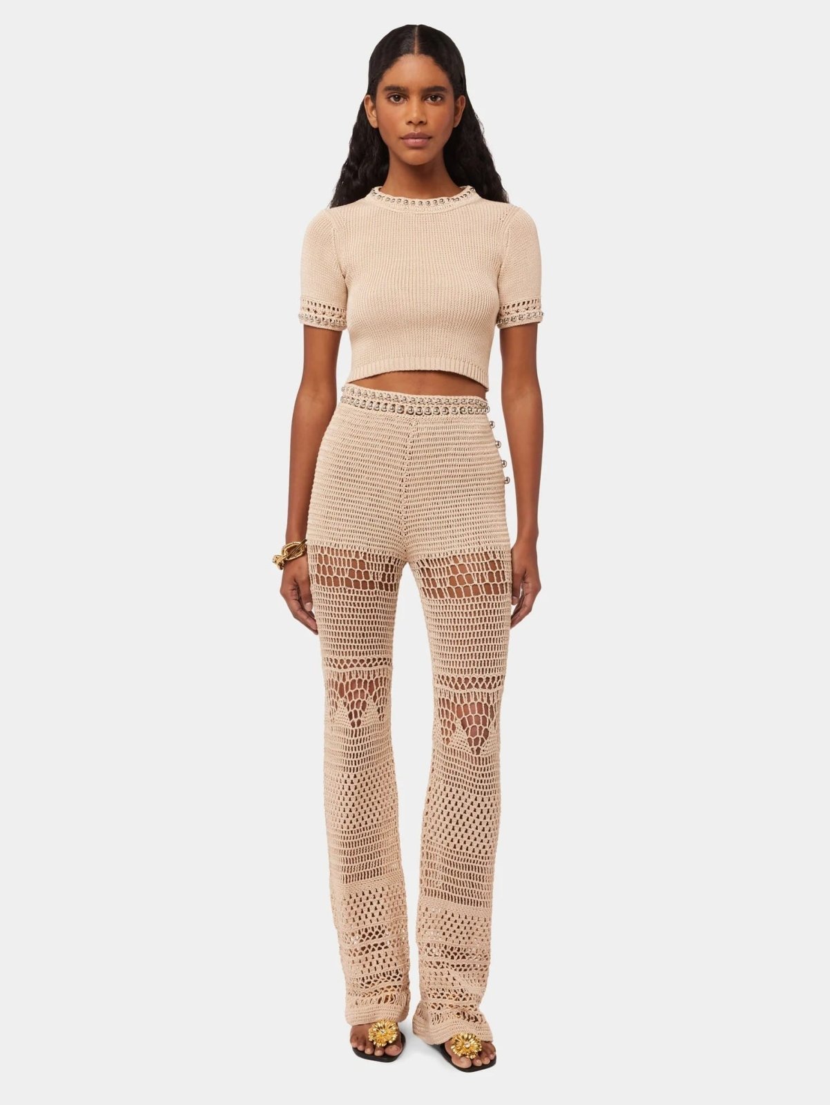 Feature a flattering high waist that accentuates your curves and offers a chic, on-trend look. With a flared leg design, they provide a sleek and sophisticated silhouette that's both versatile and flattering. These trousers are handmade, boast a crochet construction that ensures optimal comfort and a cozy feel. Whether you dress them up or down, these Rabanne's trousers are a versatile wardrobe staple that effortlessly combines fashion and comfort.