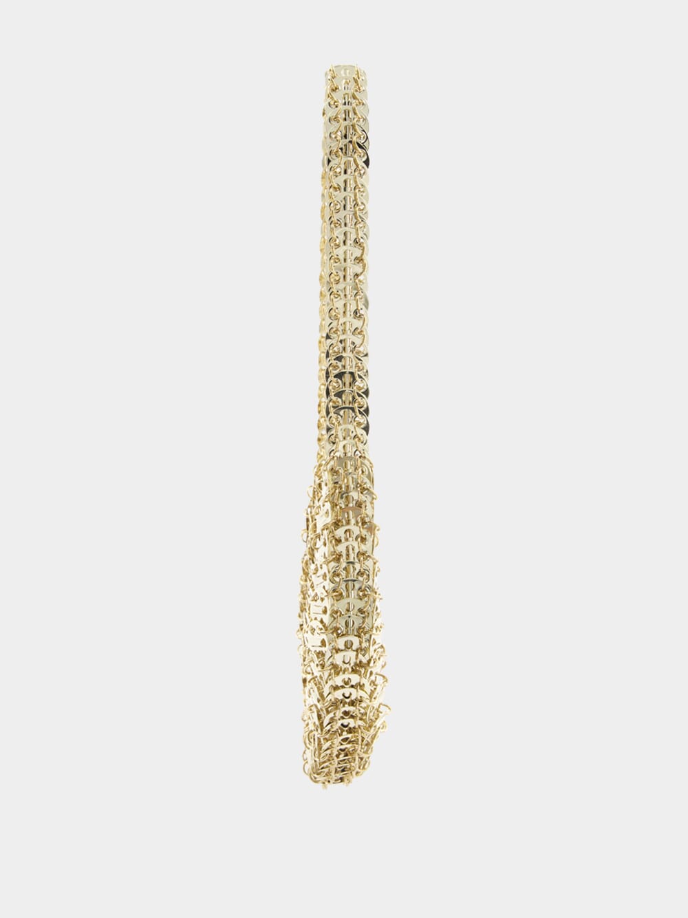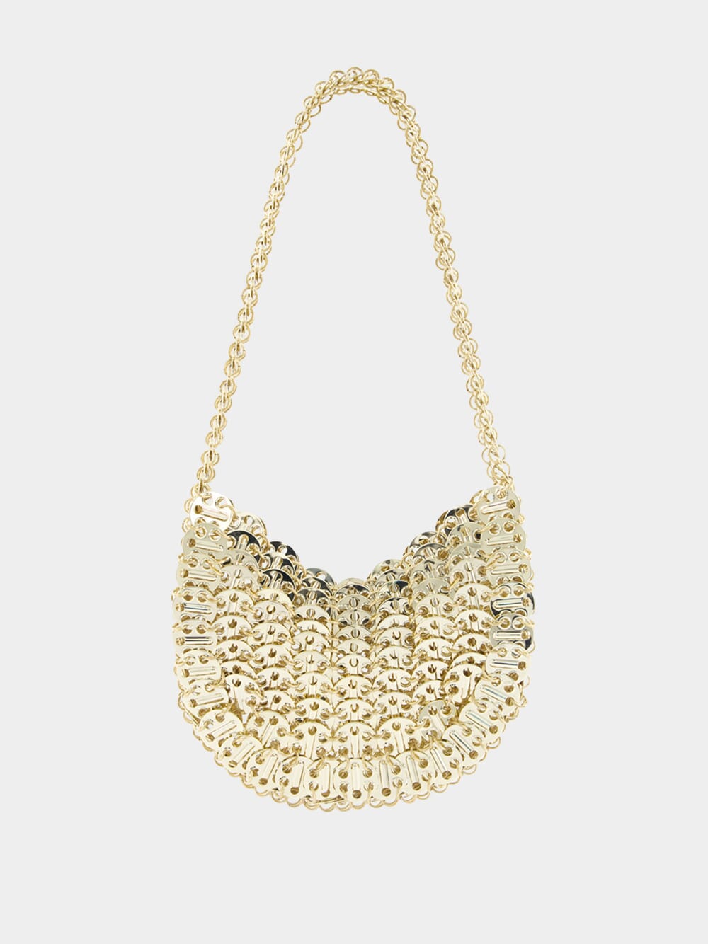 This Rabanne moon 1969 metal bag is a luxurious piece, boasting a polished finish and unique disc detailing. Its open top allows for it to be held either over the shoulder or in hand--offering you versatile style.