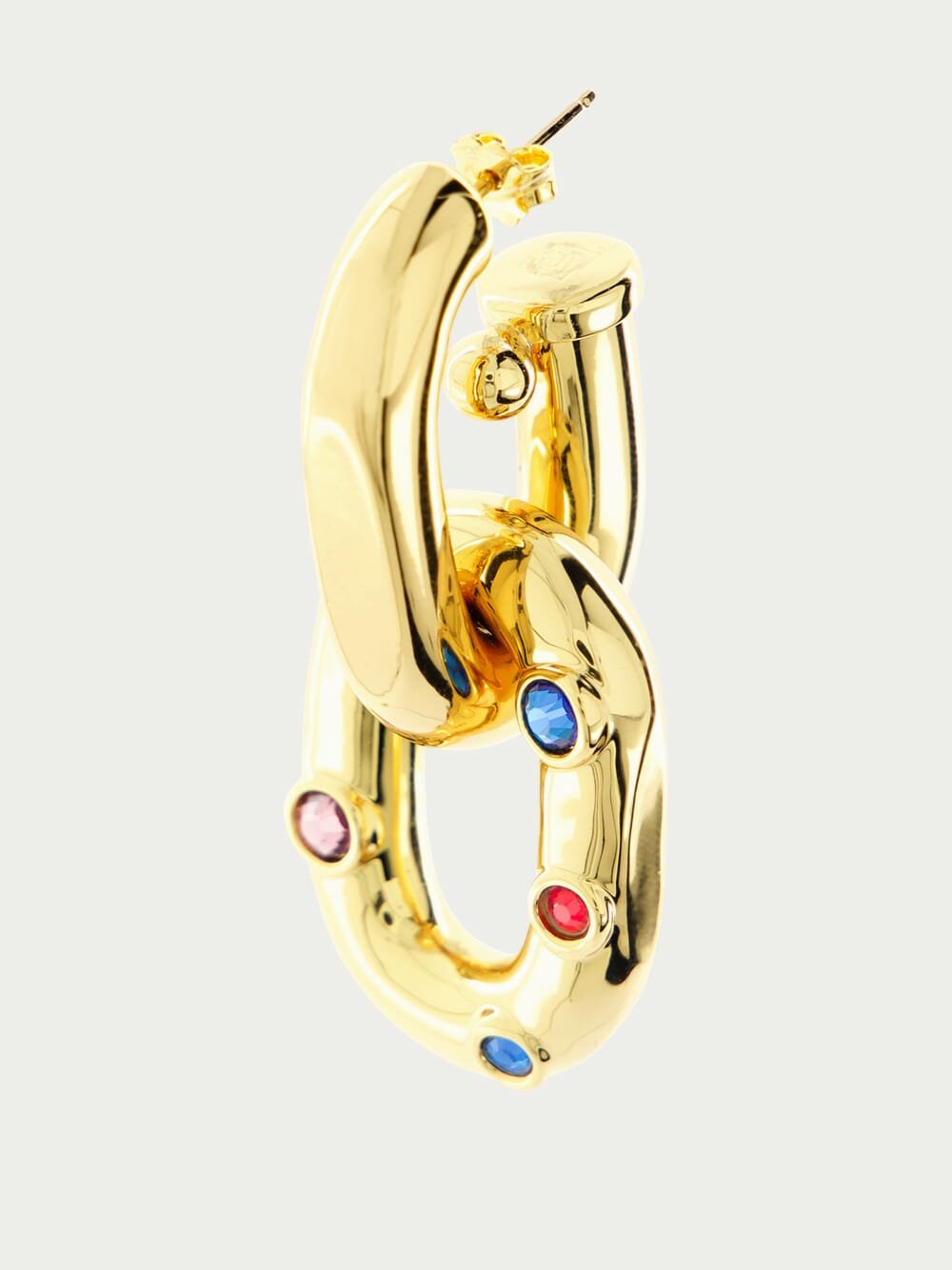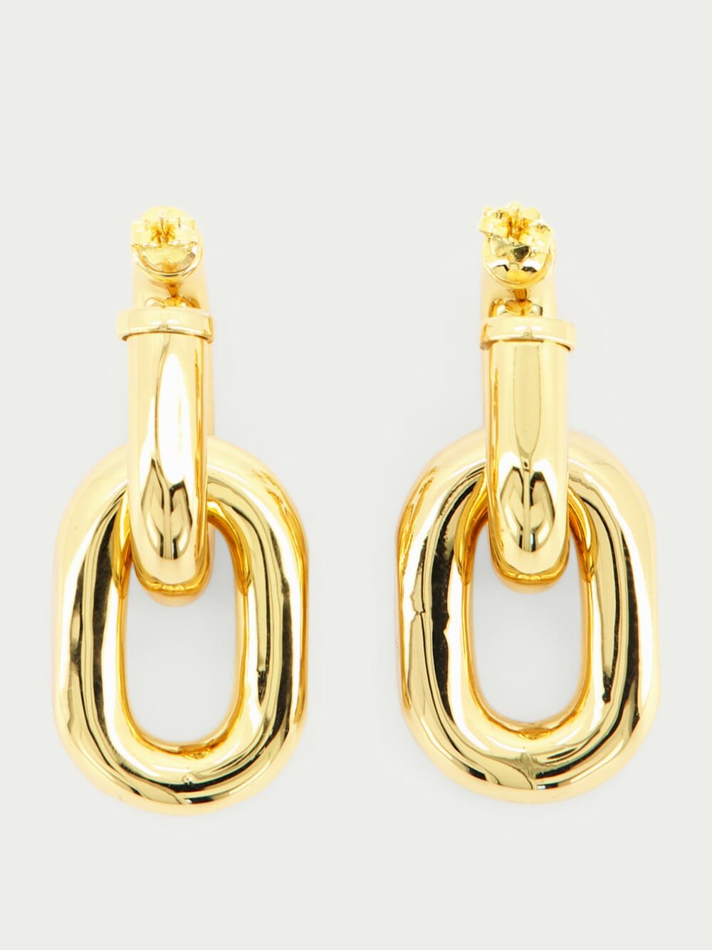 XL Link hoop earrings feature a radiant gold-tone that exudes luxury and sophistication. The polished finish adds a lustrous shine, ensuring that these earrings catch the light and draw attention with their dazzling presence. Designed with a chunky hoop silhouette, these earrings command attention with their distinctive and eye-catching appeal. The substantial size of the hoops accentuates your features, making a confident and glamorous statement.