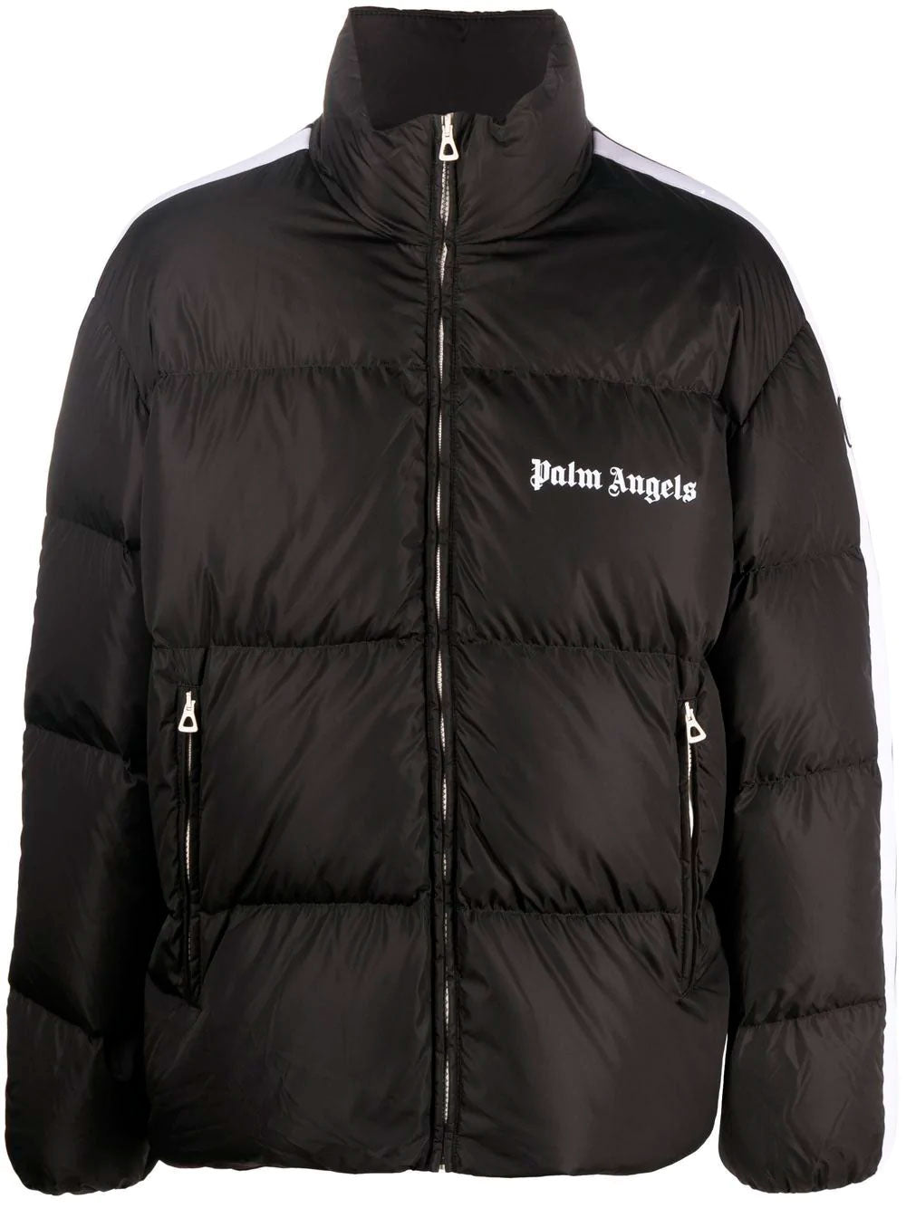 Palm Angels classic track down jacket in black technical fabric with logo printed at the front, zip closure, zip pockets and with white stripes at sleeves.