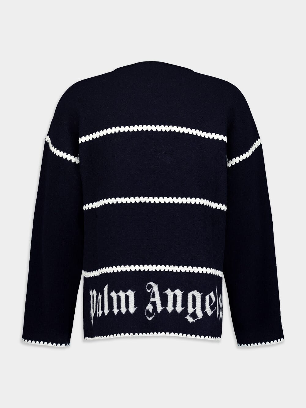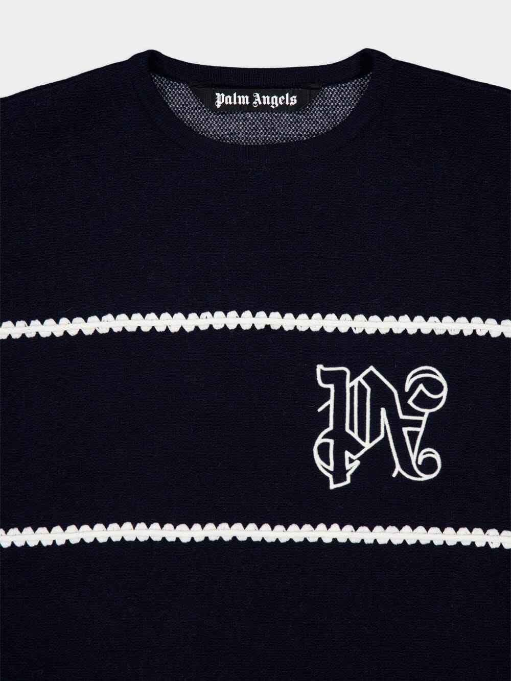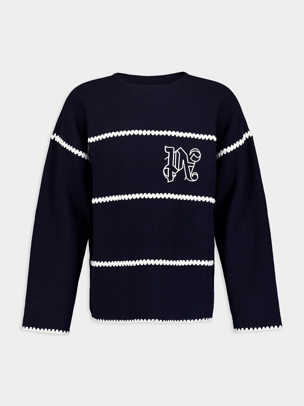 Embroidered-Monogram Striped Jumper, crafted with a luxurious wool blend, this sweater offers the finest in warmth and softness, ideal for chilly days. Its impeccable knitted construction ensures durability and a snug fit. Adorned with a chic horizontal stripe pattern and contrasting trim, this jumper exudes timeless elegance. The focal point, an exquisitely embroidered monogram at the chest, adds a personalized touch. With a classic crew neck, long sleeves, and a sleek straight hem, this jumper is a must-have addition to your wardrobe.
