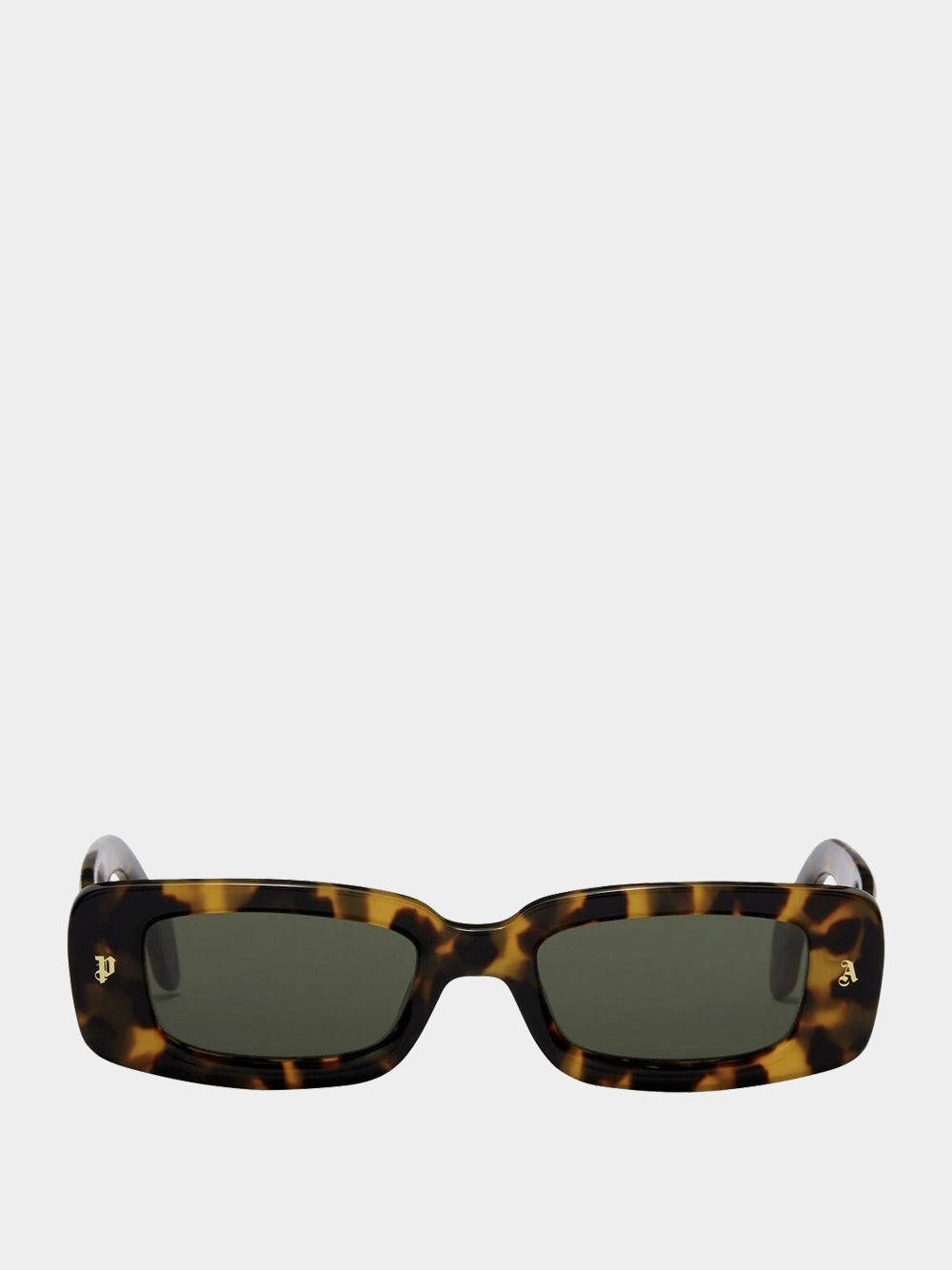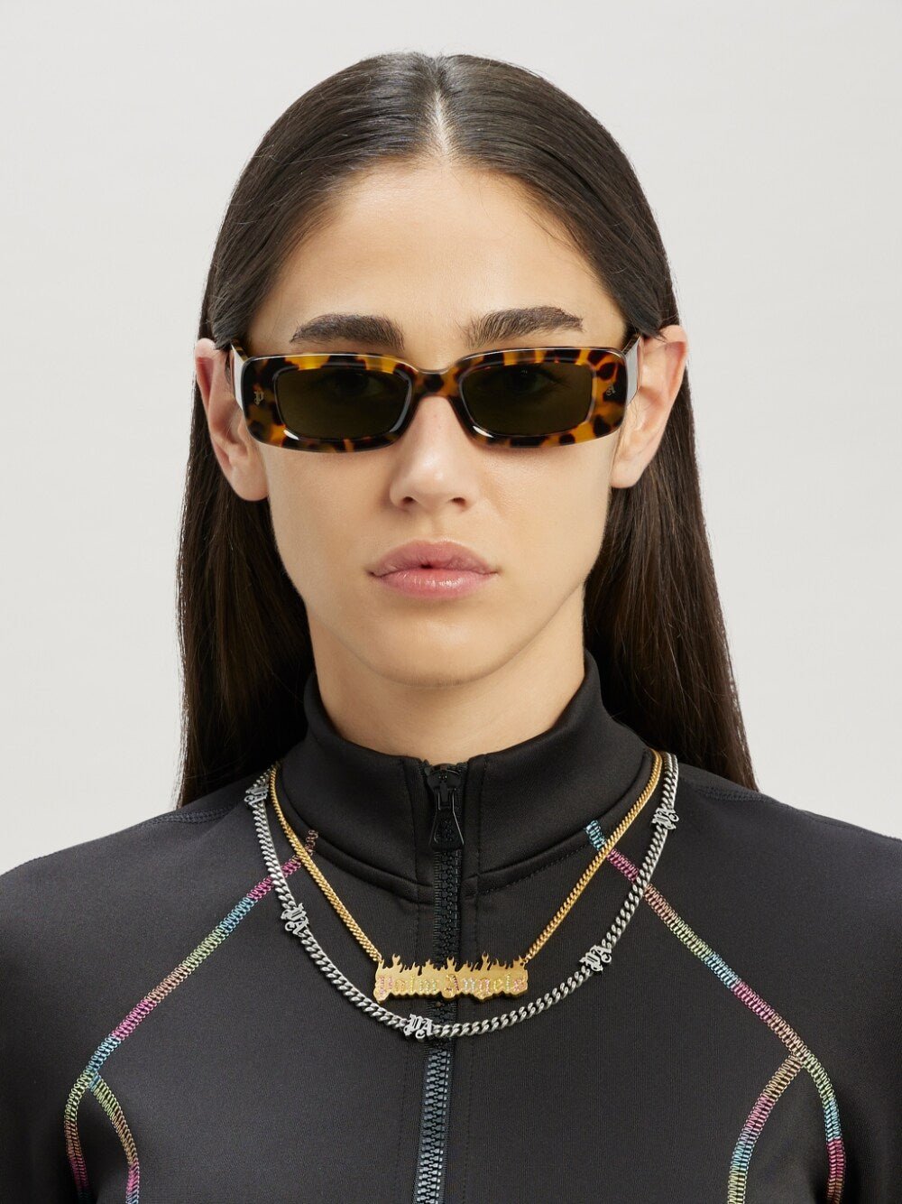 Palm Angels Lala unisex rectangle sunglasses in havana with green lenses and logo printed at sides.