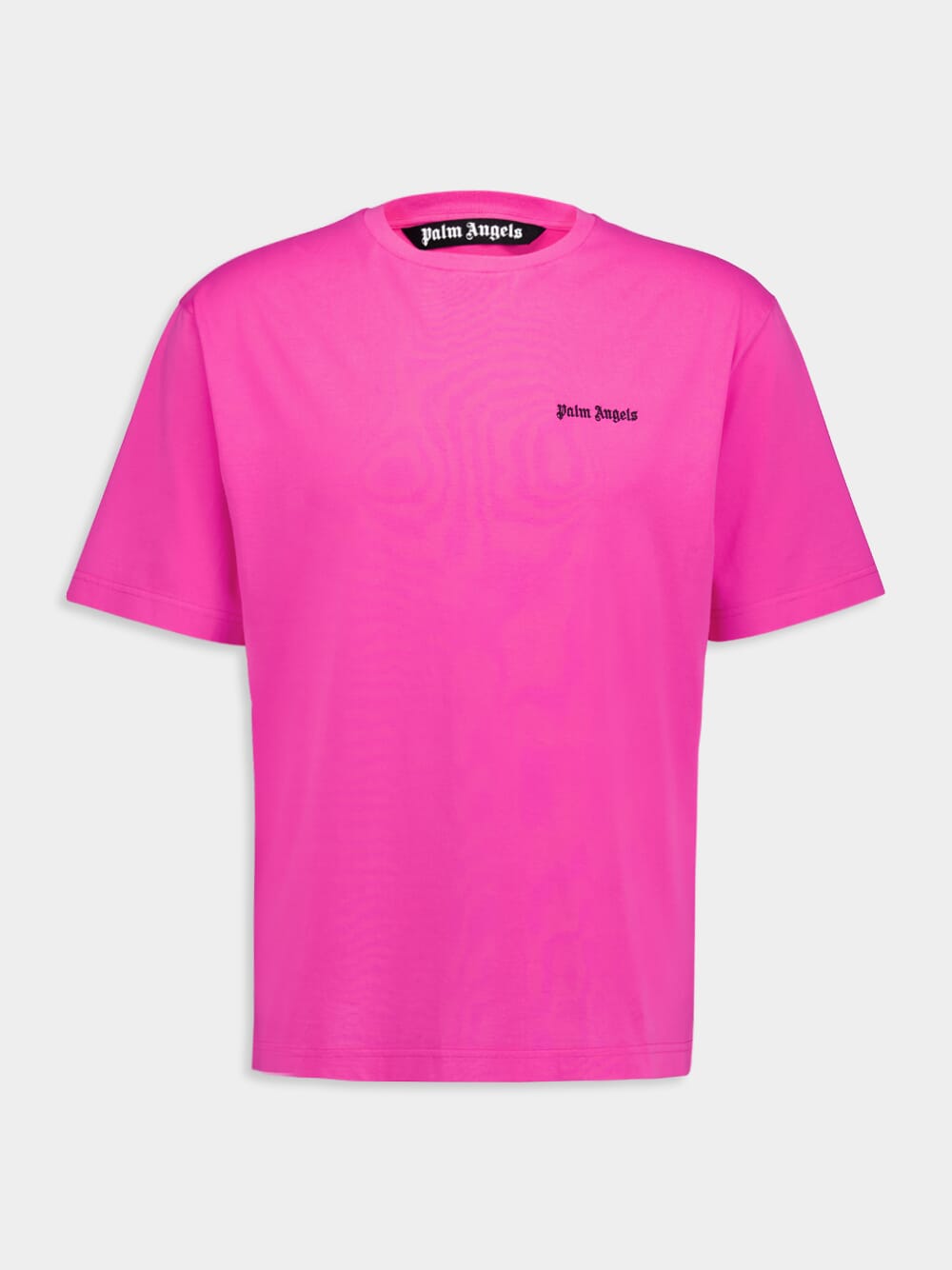 Introducing a vibrant statement piece from Palm Angels, this fuchsia-pink T-shirt embodies the brand's relaxed vibe. It features a contrasting black embroidered logo on the chest, adding a bold touch. Crafted from comfortable cotton, it offers a crew neck, short sleeves, and ribbed trim for a classic yet modern look. The straight hem completes its laid-back style, making it an eye-catching addition to your casual wardrobe.