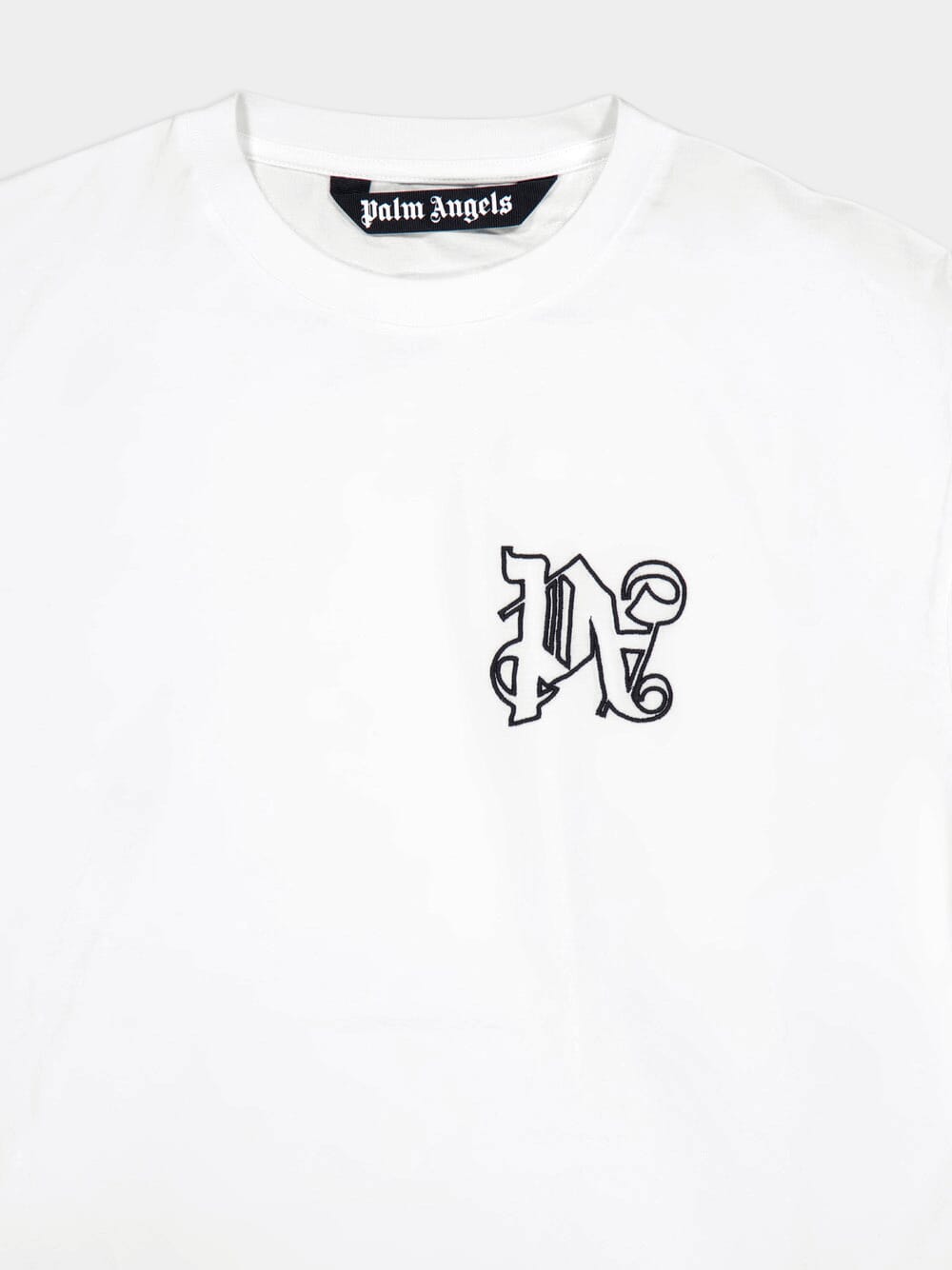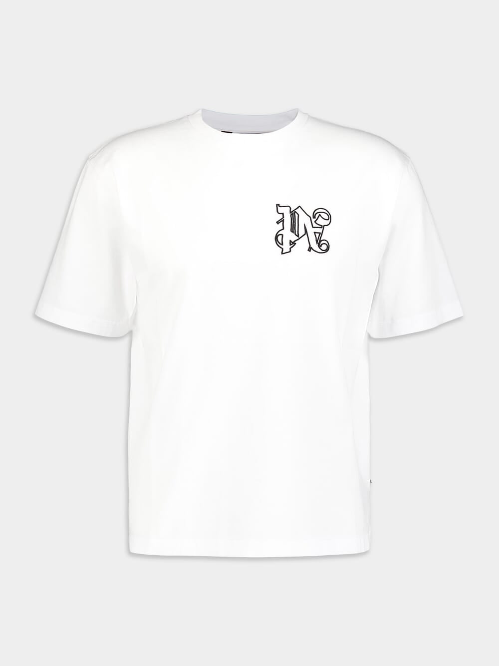 Monogram T-Shirt, a regular fit white men's crew-neck t-shirt that adds a touch of elegance to your ensemble. Crafted with precision, this t-shirt features short sleeves and showcases the iconic Palm Angels Monogram outlines embroidered in black on the heart.