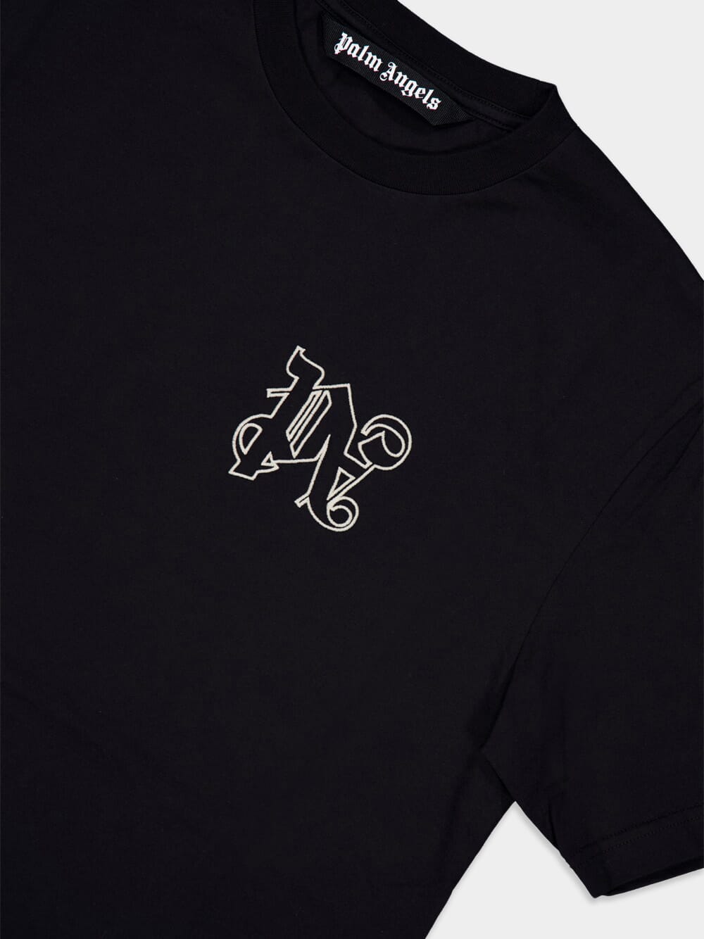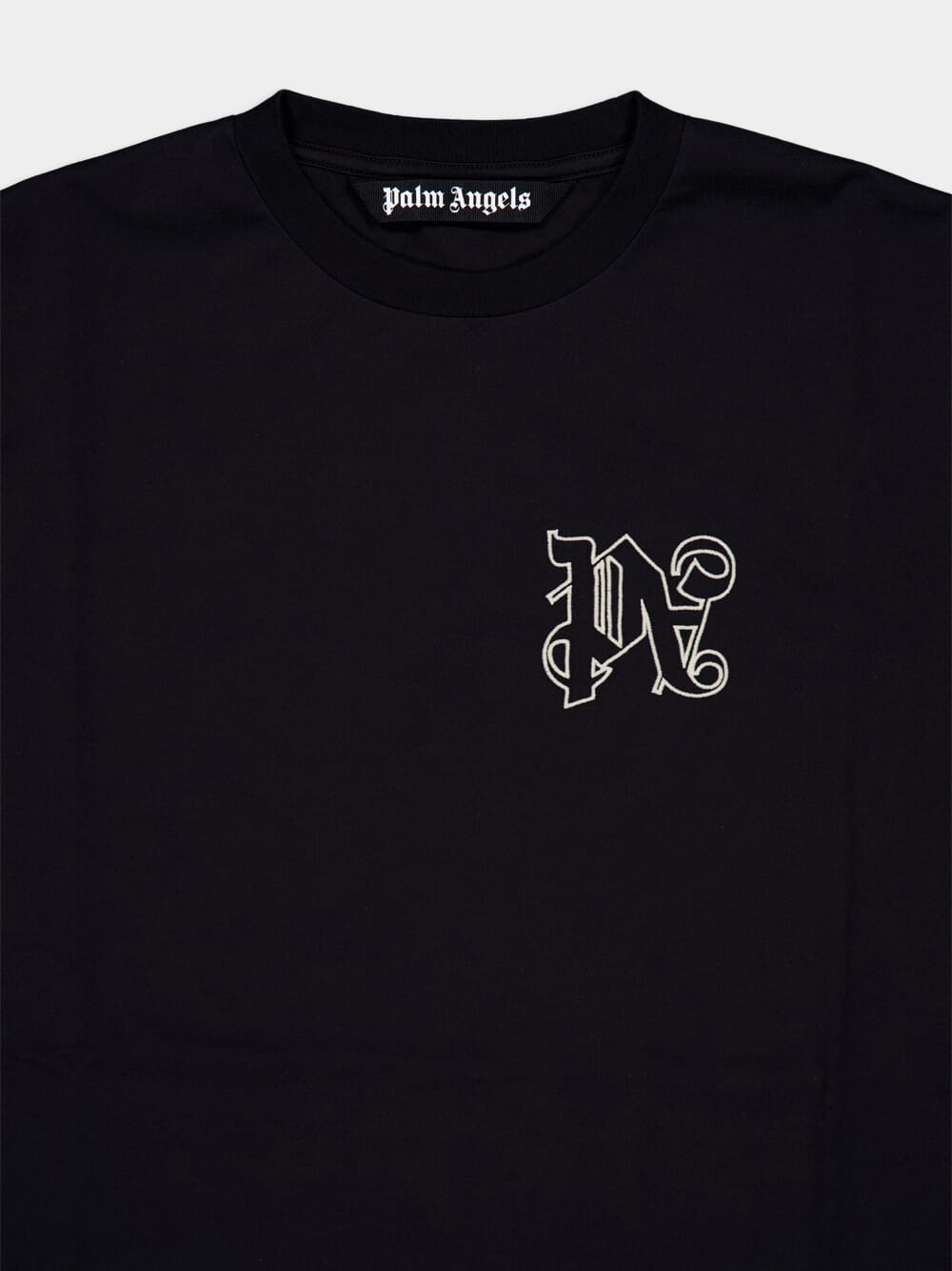 Monogram T-Shirt, a regular fit white men's crew-neck t-shirt that adds a touch of elegance to your ensemble. Crafted with precision, this t-shirt features short sleeves and showcases the iconic Palm Angels Monogram outlines embroidered in black on the heart.