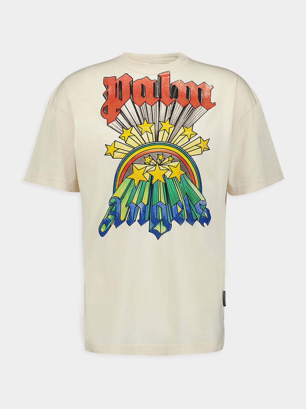 Rainbow-Graphic Crew-Neck T-Shirt, featuring a captivating rainbow print and logo detail to the front, this t-shirt is a true fashion statement. The classic crew neck and short sleeves offer a comfortable fit for all-day wear. With a sleek straight hem, this tee effortlessly combines modern flair with timeless design.