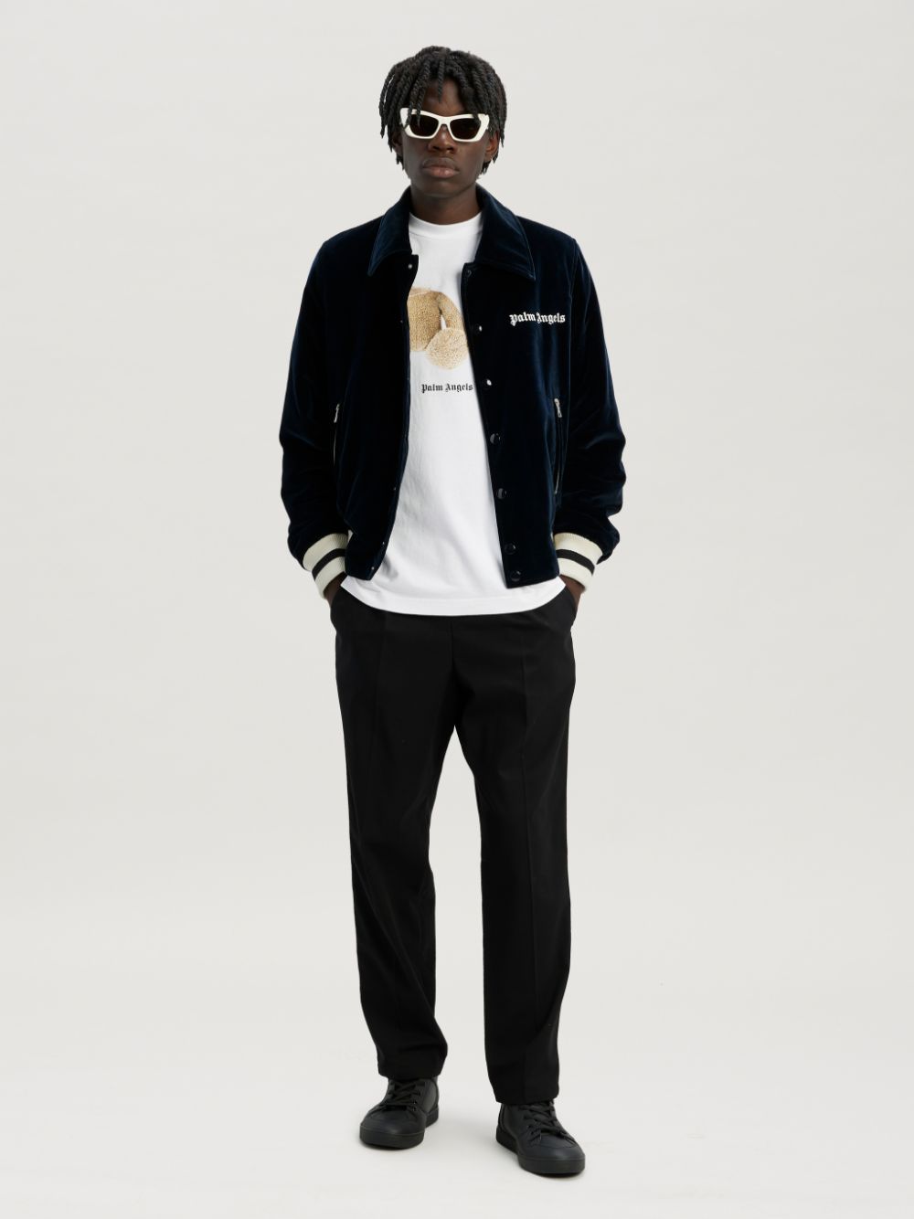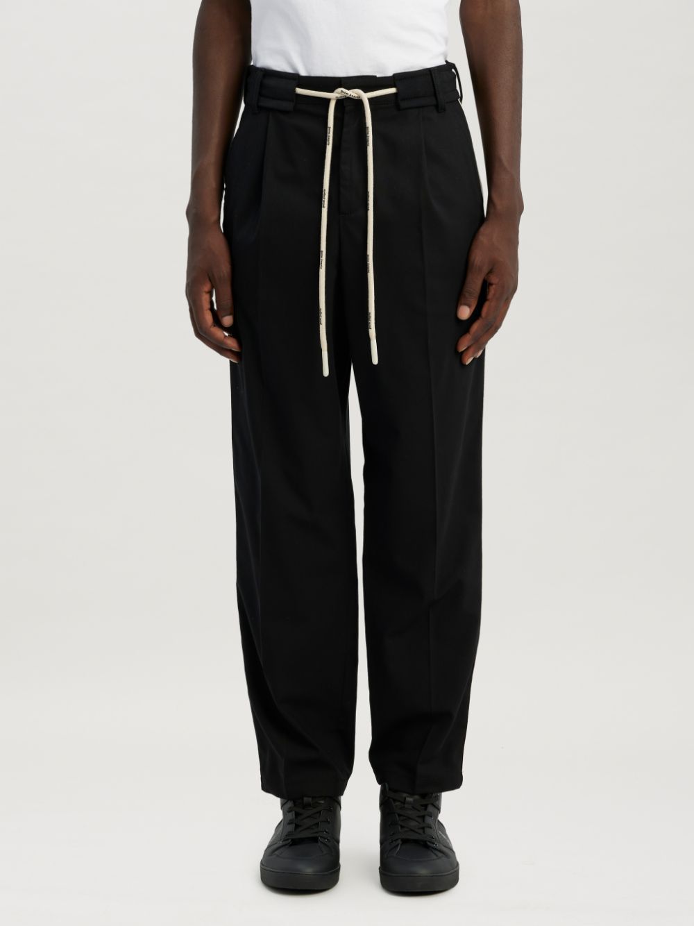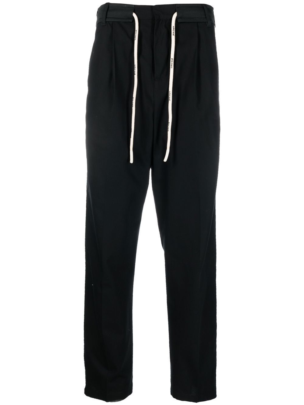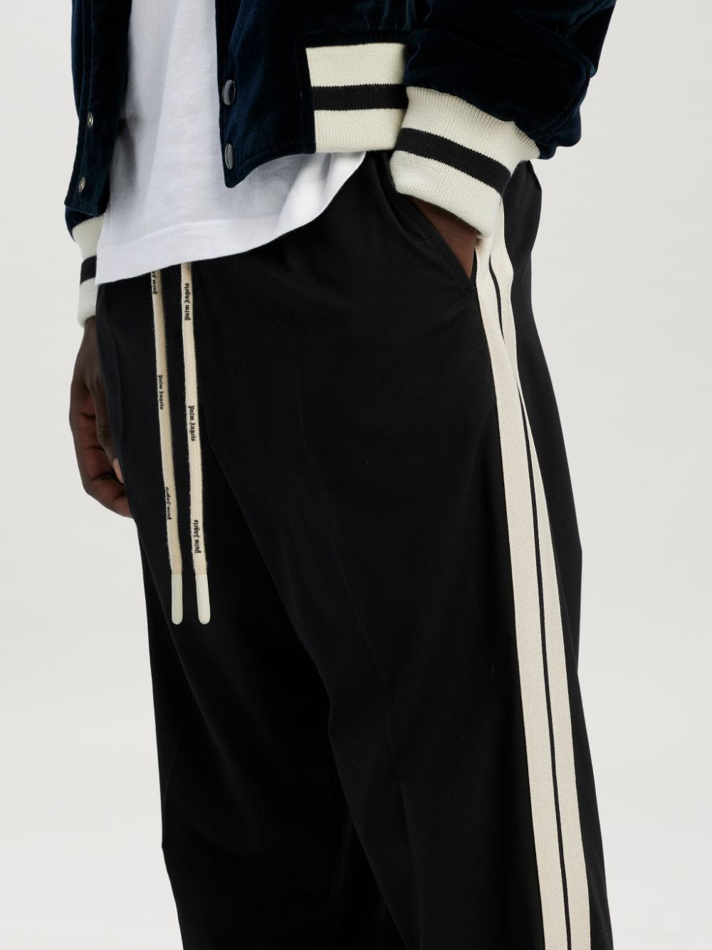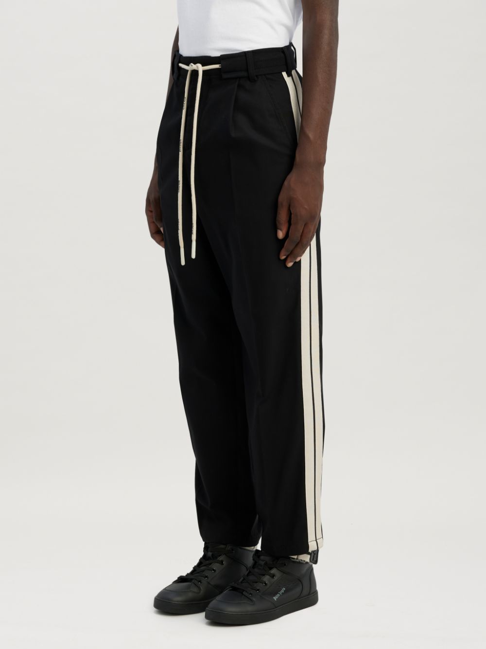 Palm Angels track belt pants in black cotton with belt detail featuring white logoed drawstring, two pocket styling, white stripes at side, two welted pockets on the back and a regular fit.