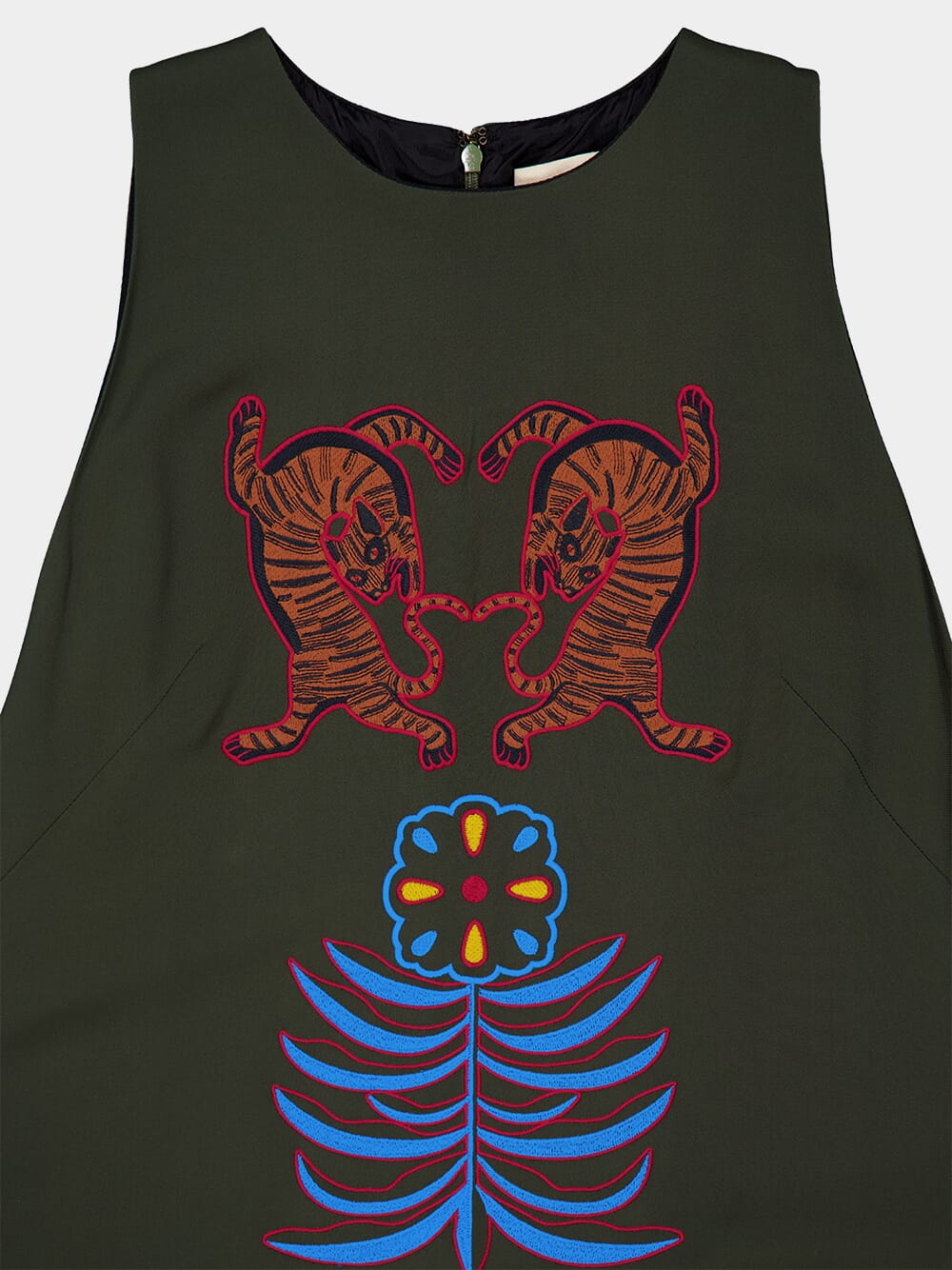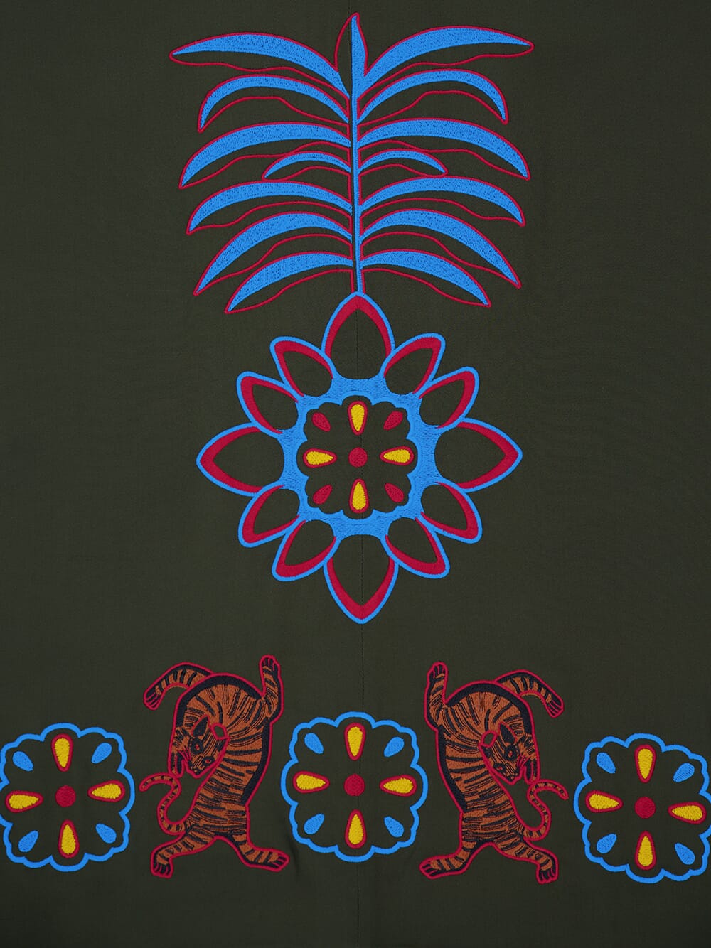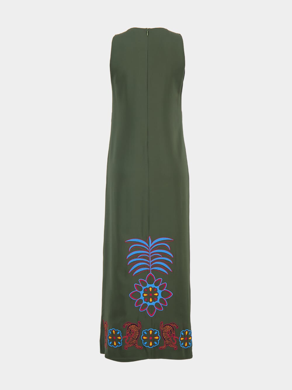 Make a bold yet graceful statement with the Ebad Duffel Bag Embroidered Sleeveless Maxi Dress. Crafted from a soft, stretchy blend of viscose and elastane, this flowing maxi dress features intricate embroidery with tiger and floral motifs, adding a touch of wild elegance to its striking green hue. The sleeveless silhouette enhances its fluidity and ease, while the detailed craftsmanship brings an artful dimension to the design. A standout piece that embodies strength, beauty, and refined individuality. Made in Portugal.