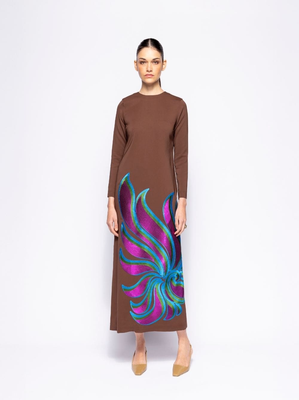 Kentia Coffee Bean Embroidered Long-Sleeved Maxi Dress