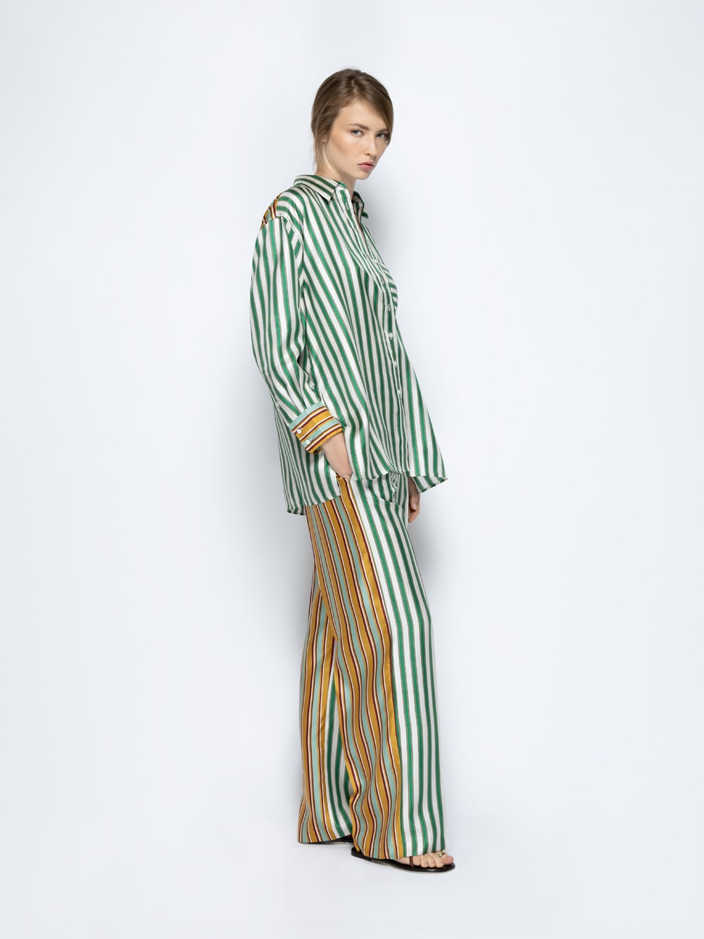 A study in rhythm and refinement, the Marie Green Stripes Silk Twill Shirt is crafted from 100% silk twill in a vibrant green and white stripe. Its oversized silhouette is accented by a contrasting patch pocket and boldly striped cuffs in mustard and rust tones. Light, fluid, and playfully tailored, it brings modern energy to timeless shirting. Made in Portugal.