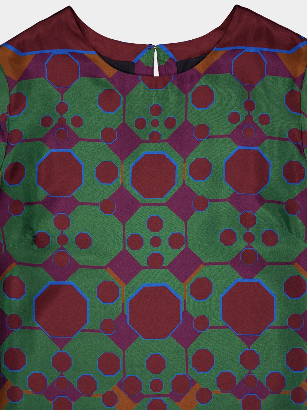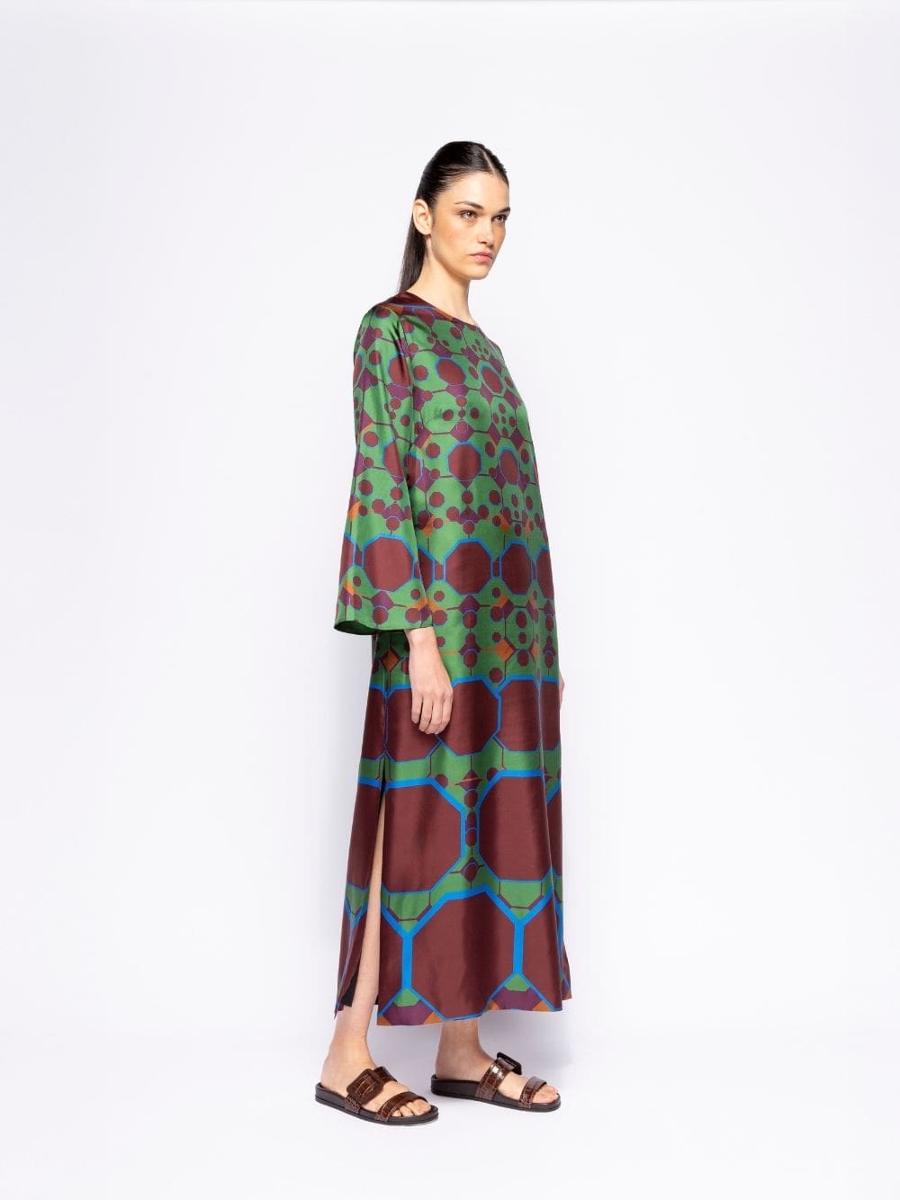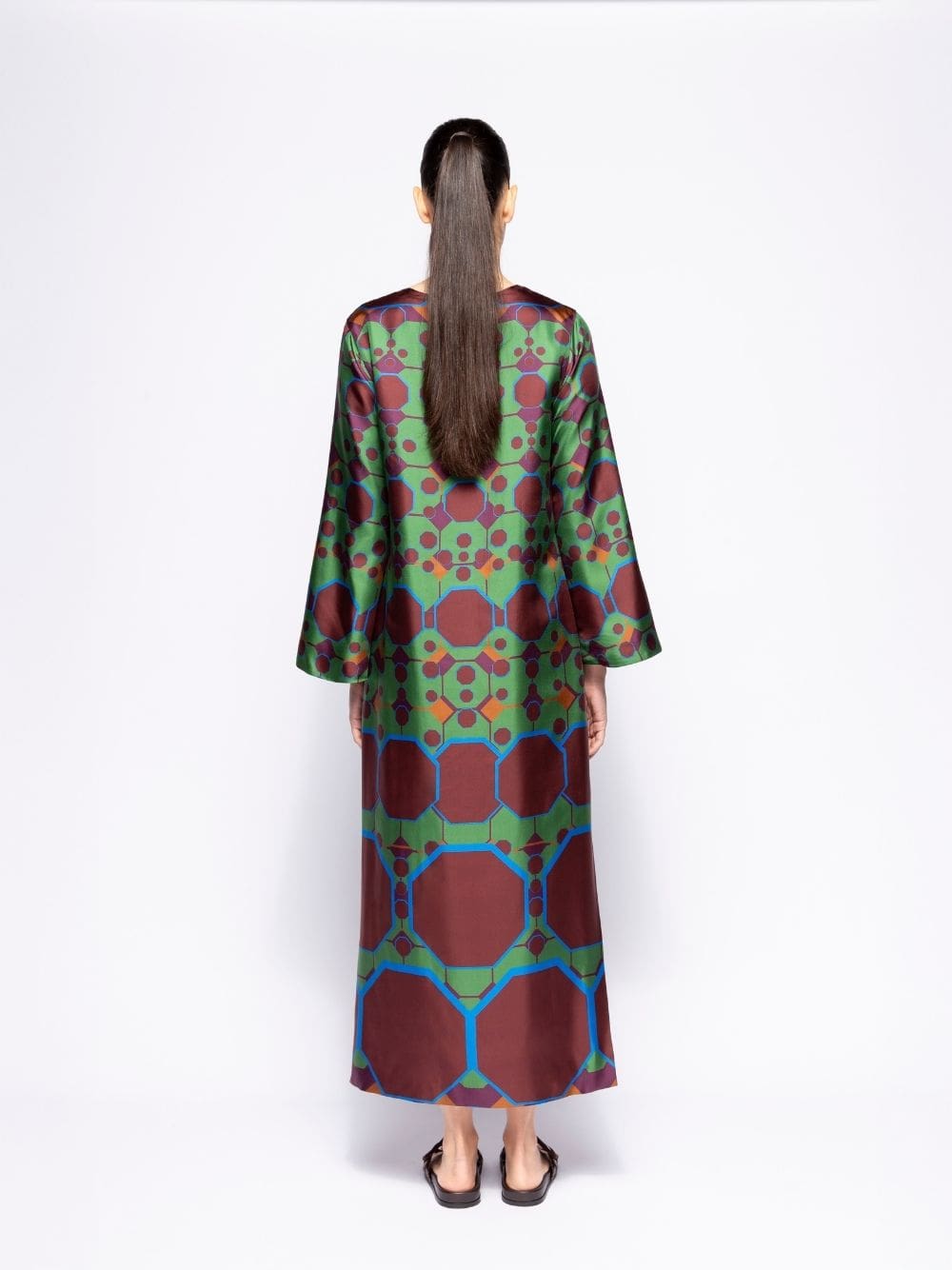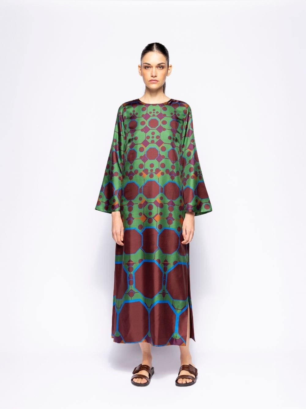 Unveil effortless elegance with the Shirley Octa Print Printed Silk Twill Maxi Dress. Crafted from luxurious silk twill, this long-sleeved dress showcases a stunning octagonal print, adding a modern, geometric flair to its timeless silhouette. The fluidity of the silk fabric drapes gracefully, creating an ethereal movement with every step. With its maxi length and exquisite detailing, this dress effortlessly transitions from day to night, making it a perfect choice for both formal gatherings and sophisticated evenings out. Made in Portugal.