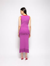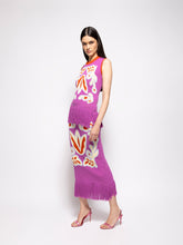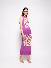 The Tina Bellflower Jacquard Tank Top with Fringes brings an artisanal touch to your wardrobe. This knit top features an intricate jacquard pattern in warm hues of purple, brown, and cream, finished with a fringe hem for added texture and flair. Perfect for layering or as a standout piece in spring and summer ensembles. Made in Portugal.