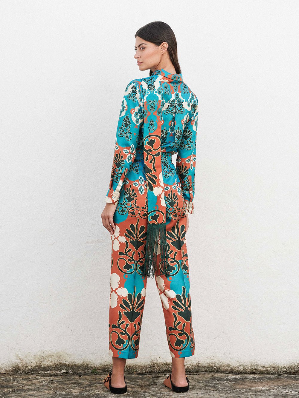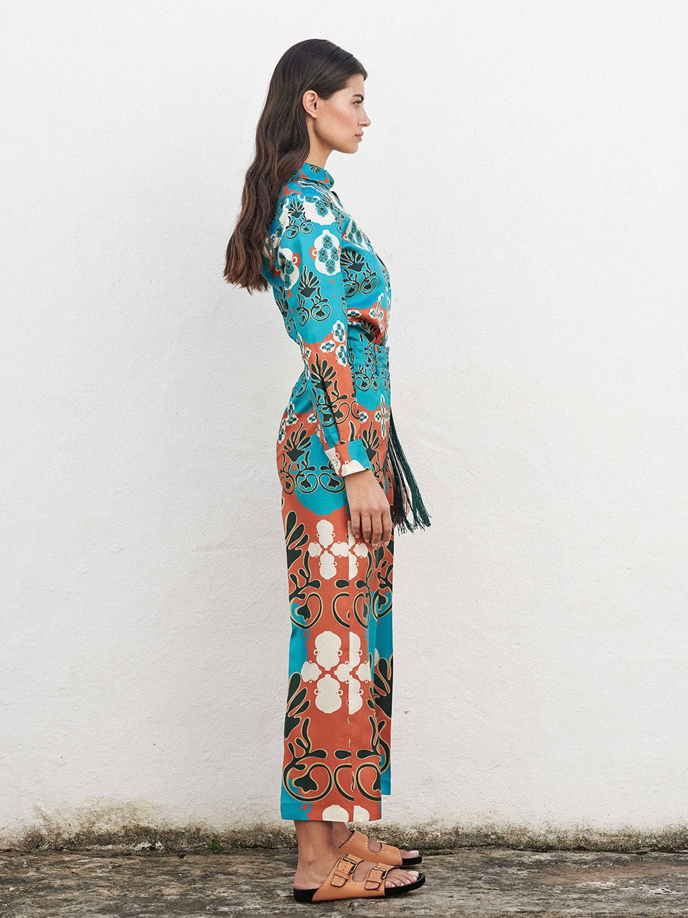 Paula Sonia printed pants crafted using high-quality printed twill silk, these pants feature a tailored design that is both elegant and practical. The wide-leg silhouette is both comfortable and flattering, while the elastic at the back and belt loops ensure a secure and comfortable fit. The two pockets at the front add a practical touch, allowing you to carry your essentials with ease.