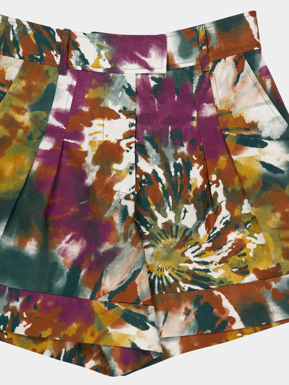 The Virgo Ocotilo Print Linen Printed Wide-Leg Shorts add a vibrant touch to your summer wardrobe with their bold tie-dye pattern in earthy tones of green, orange, and burgundy. Made from 100% linen, these wide-leg shorts offer breathability and comfort with a relaxed silhouette, making them perfect for casual, warm-weather looks. Made in Portugal.