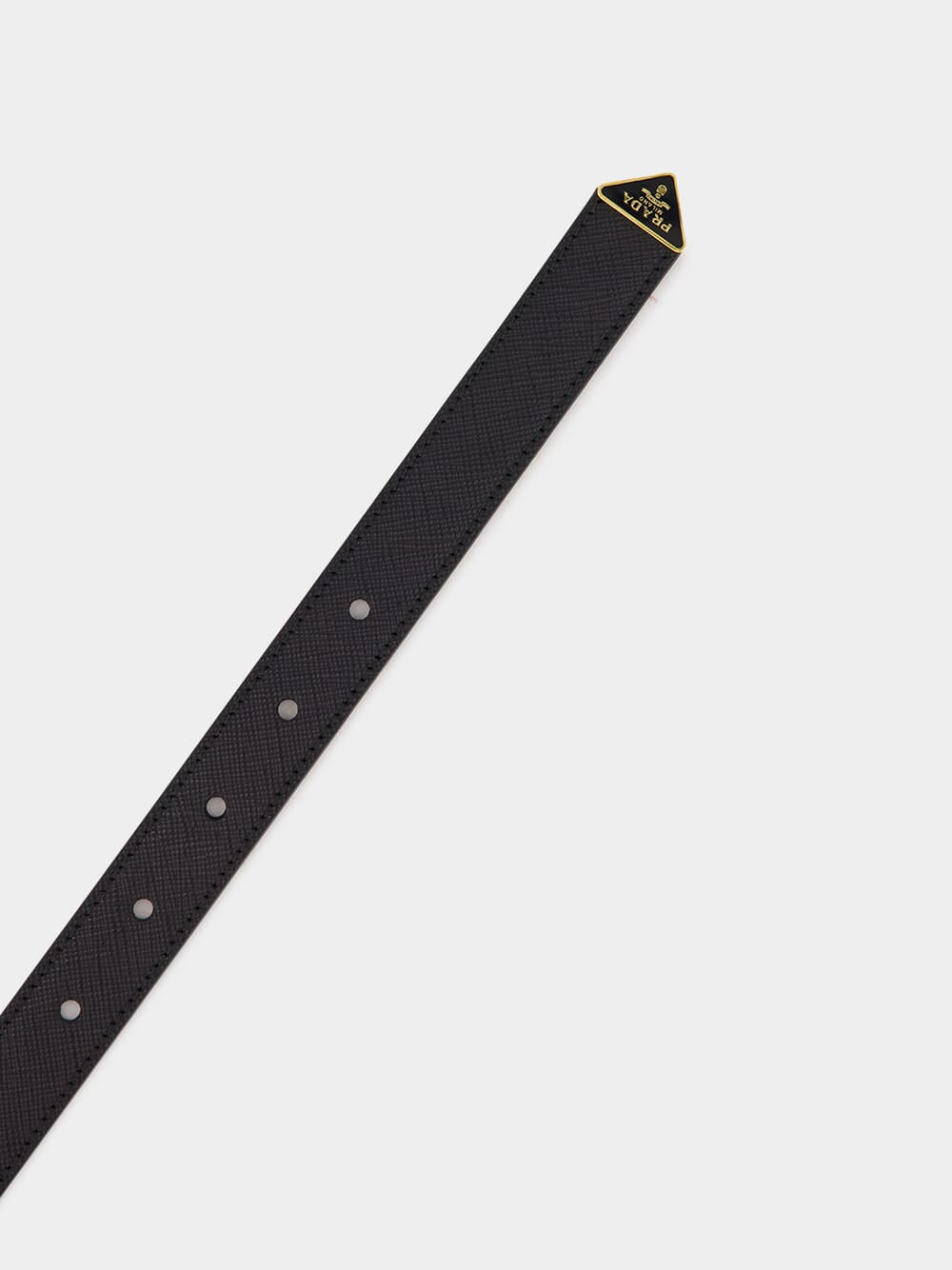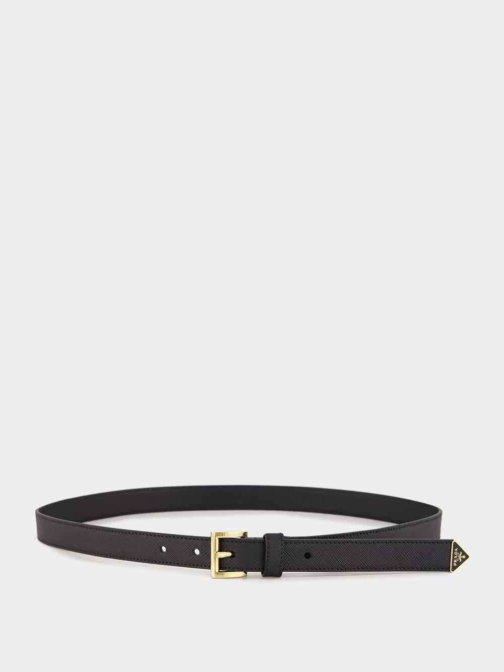 This sleek and sophisticated belt is crafted from luxurious black Saffiano leather, adorned with the iconic enameled metal triangle logo. Featuring a refined metal buckle, it embodies timeless elegance and style. Perfect for adding a polished touch to any outfit, this versatile accessory is suitable for both formal and casual wear, making it an essential addition to any wardrobe.