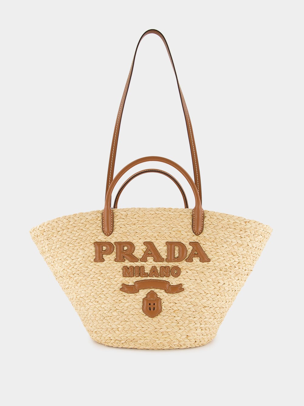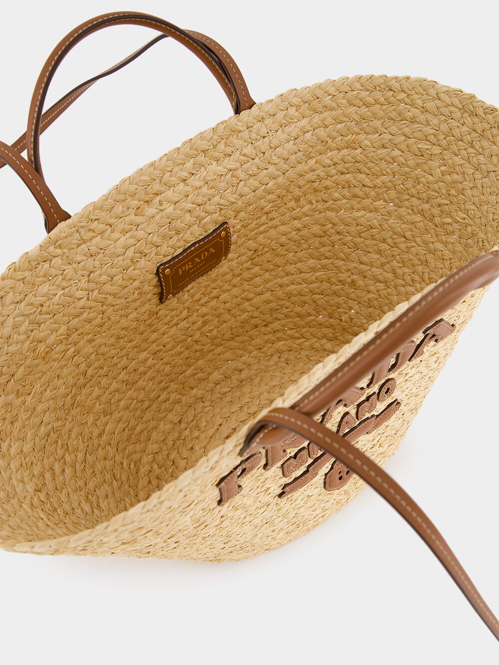 A re-edition of an iconic style from 1995, this large shopping bag embodies Prada codes in a casual, versatile silhouette that bridges past and present. The design, made from natural raffia and leather, features an embossed leather logo patch, double leather handles for use as a handbag or shoulder bag, and leather lettering logo on the front. The unlined interior maintains a lightweight and natural feel, perfect for summer outings and beach trips.