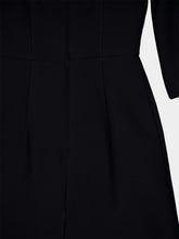 Prada presents this elegant black silk-blend midi dress, a perfect embodiment of confidence and sophistication. Part of the AW19 collection, it features a plunging V-neckline, three-quarter sleeves, and a fitted waist that accentuates the feminine silhouette. The flared skirt, back zip fastening, and subtle back slit at the hem add refined details to this timeless piece. Perfect for formal occasions or an evening out, this dress exudes modern luxury.