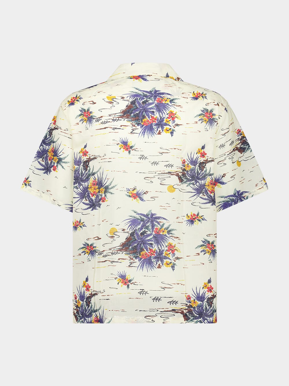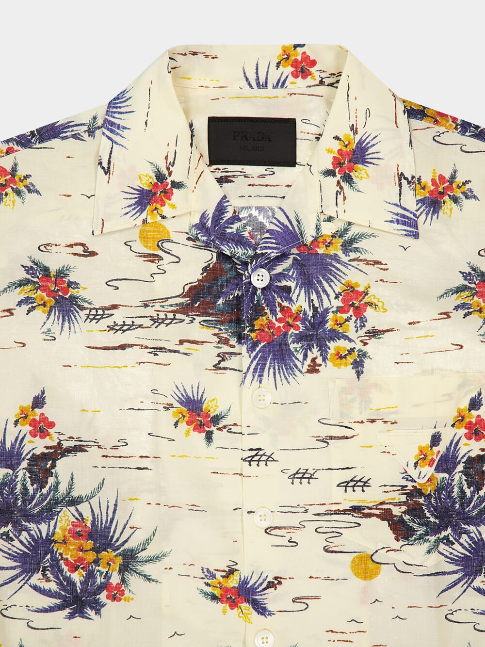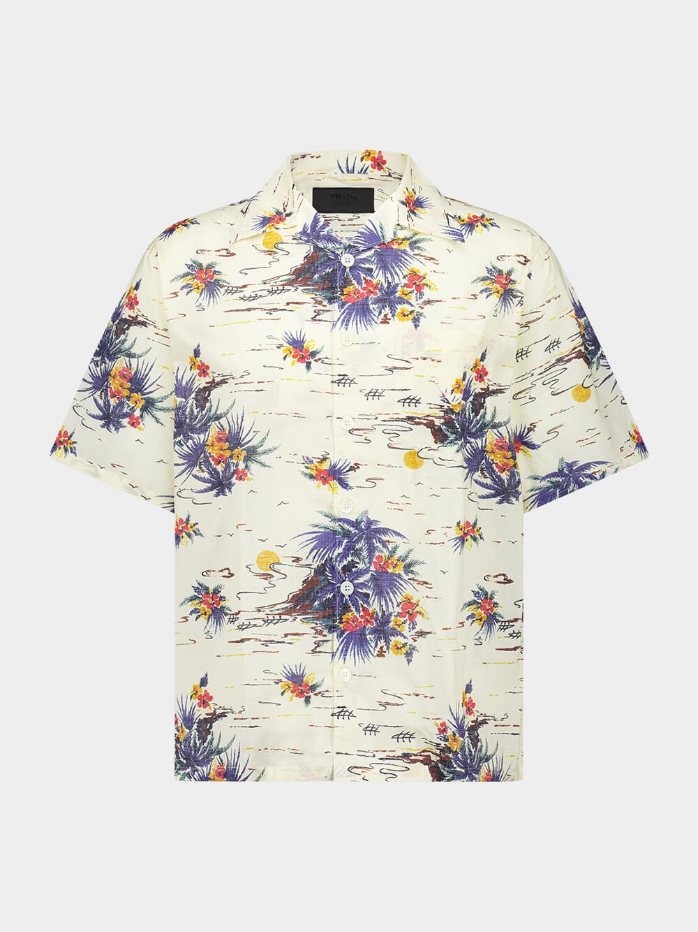 This Prada cream short-sleeve shirt adds a vibrant, tropical touch to summer wardrobes. Crafted from lightweight Batista cotton, it features a classic button-up front and an open collar with an eye-catching Hawaiian print in vivid colors. Perfect for warm-weather outings, this shirt combines luxury craftsmanship with a relaxed, vacation-ready style.