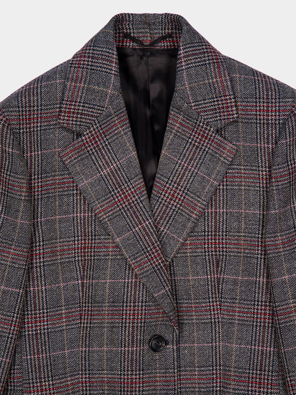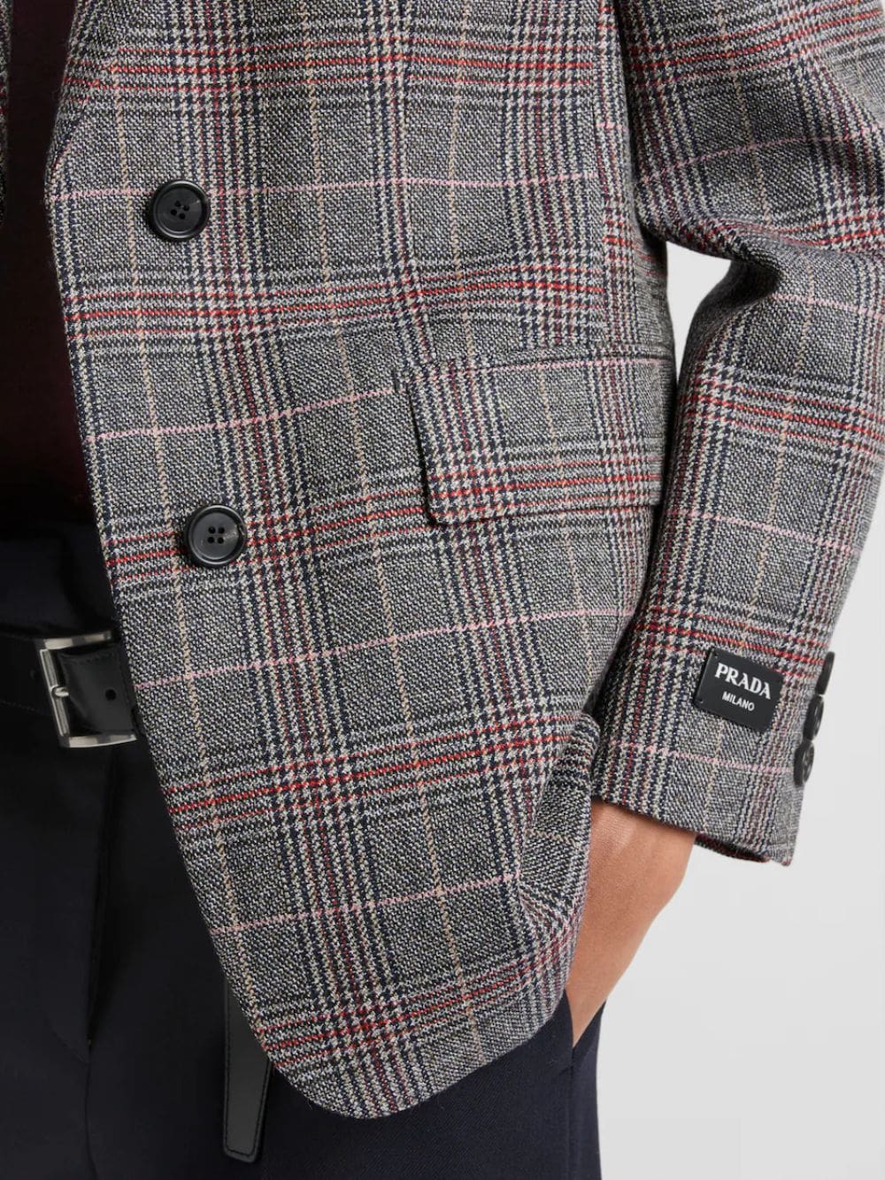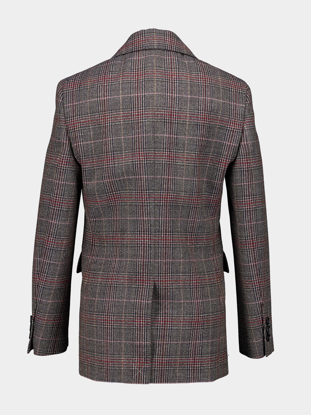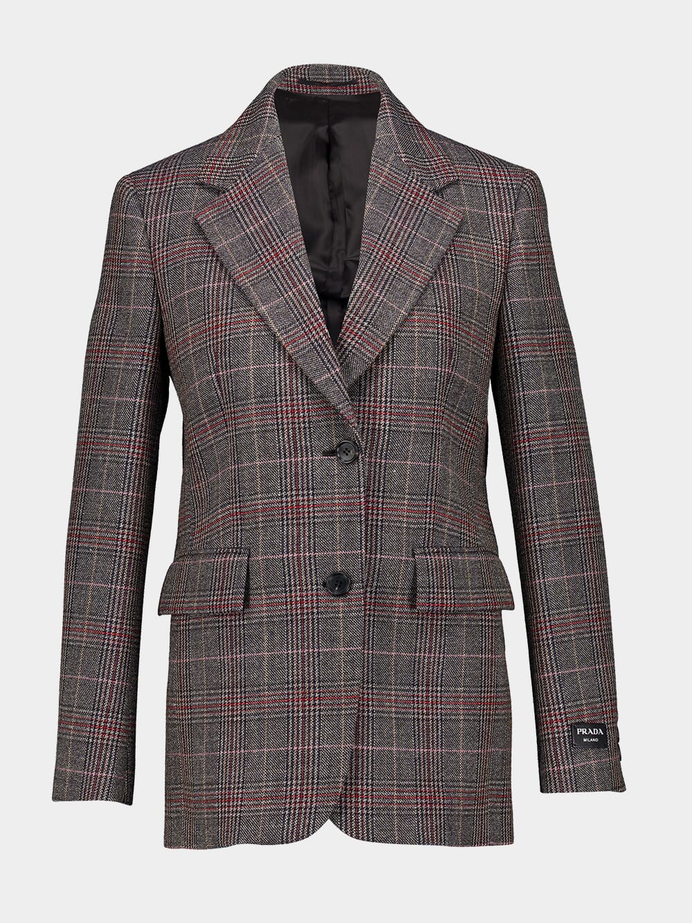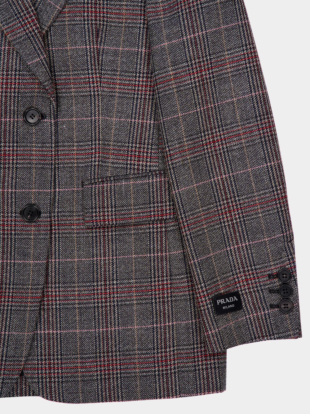 The timeless elegance of Prince of Wales fabric enhances this single-breasted blazer. It features a menswear fit with a notch lapel, front two-button closure, straight three-button sleeves, flapped welt pockets, and a back vent. The piece is lined and finished with a leather logo label.