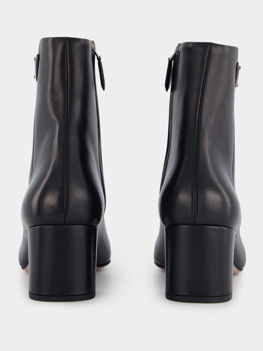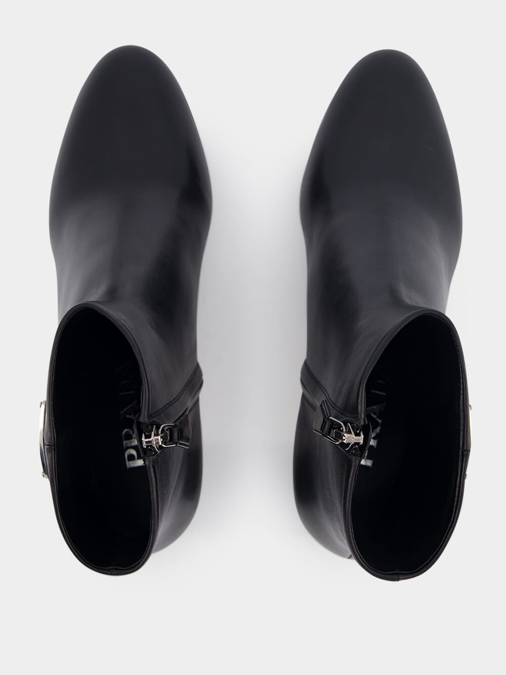Leather Booties, feature a luxurious leather lining and enameled metal triangle logo, these booties exude timeless elegance. The side zipper closure ensures easy wearing, while the 14 cm boot leg adds a touch of allure. Experience supreme quality with the leather sole and a touch of brand authenticity with the metal lettering logo. Complete your ensemble with the 55 mm leather-covered heel for a perfect blend of fashion and practicality.