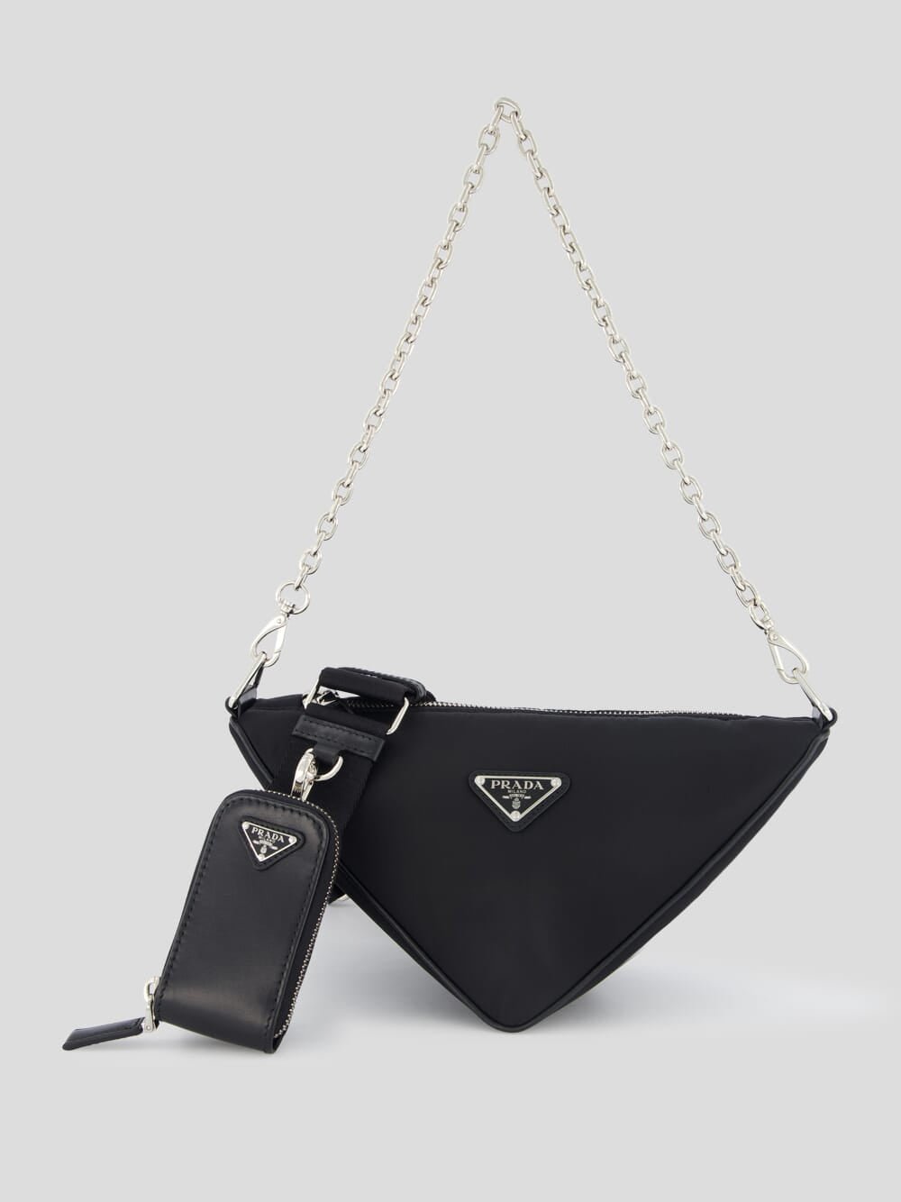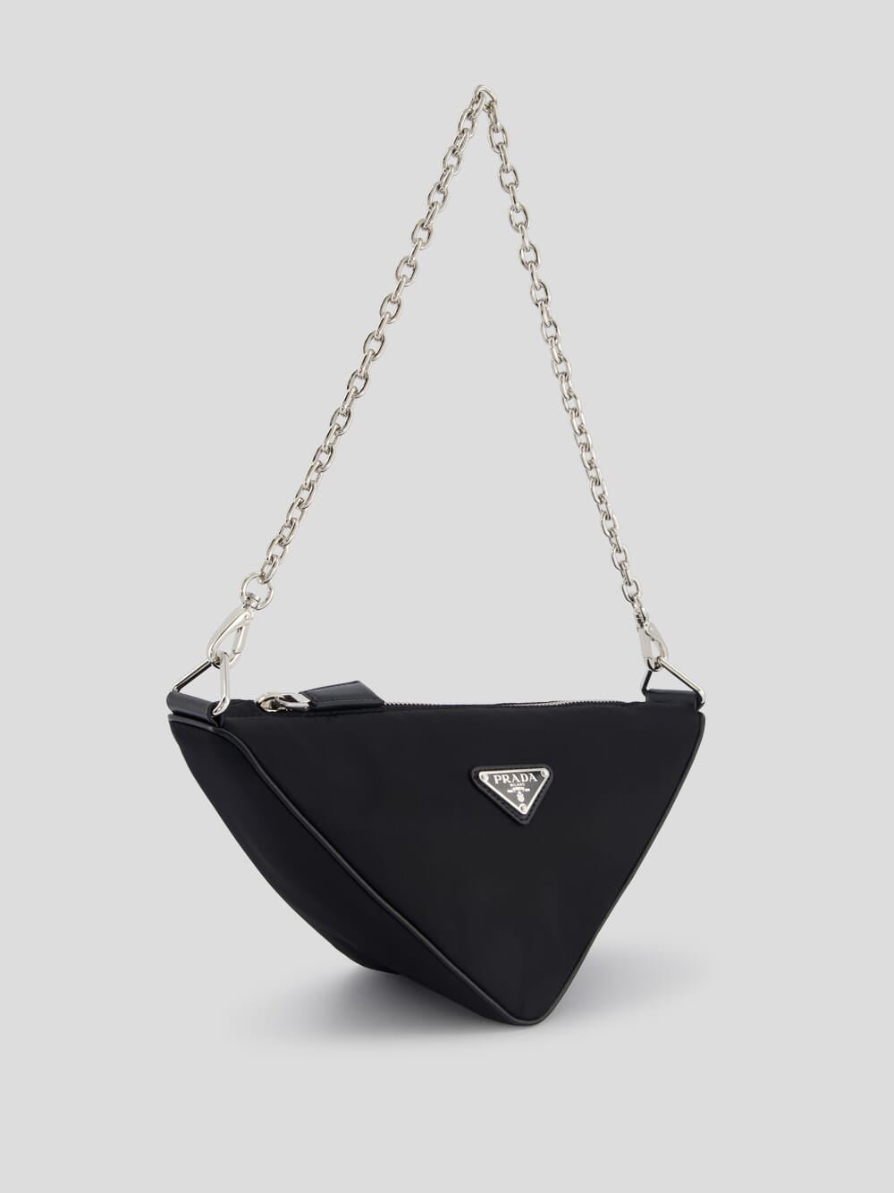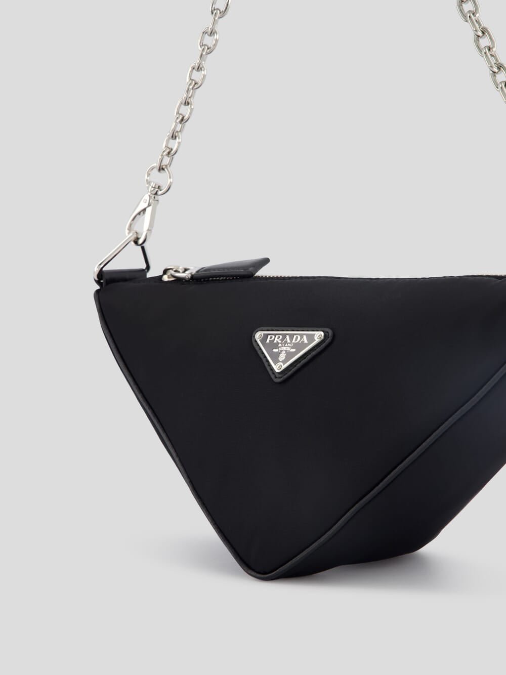 Prada Triangle Shoulder Bag, a stylish and eco-conscious choice crafted from recycled nylon. This shoulder bag showcases silver-tone hardware, adding a touch of sophistication to your ensemble. Its zip closure ensures secure storage, while the removable chain shoulder strap and adjustable logoed fabric shoulder strap offer versatile carrying options. The bag's interior is lined in black logoed fabric, providing a luxurious feel. Adorning the front is the iconic triangle logo in enamelled metal, showcasing the brand's impeccable craftsmanship. Complete with a removable compartment, this bag is a perfect blend of fashion and functionality.