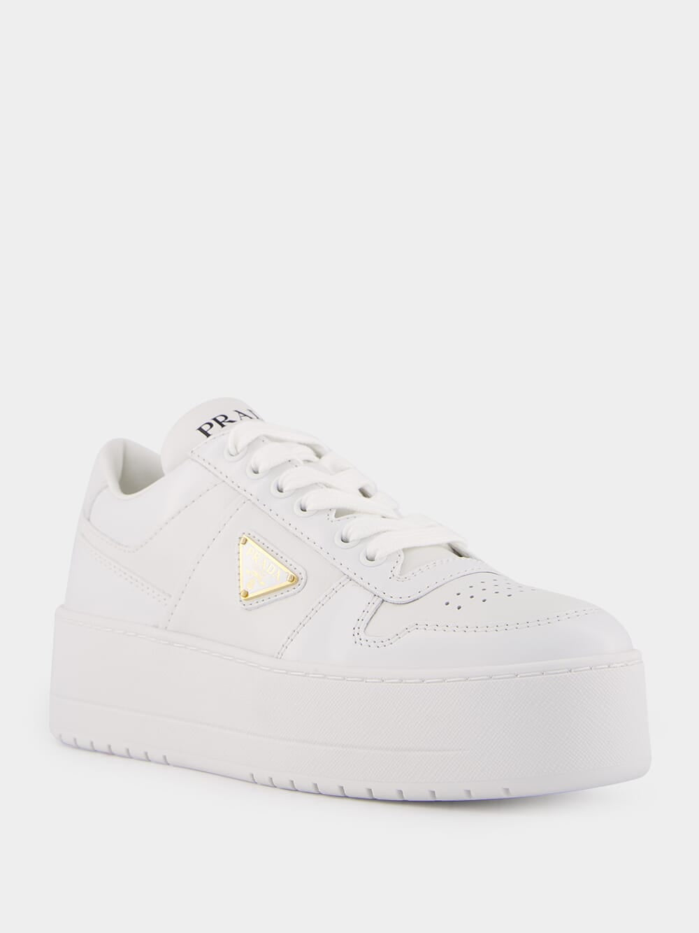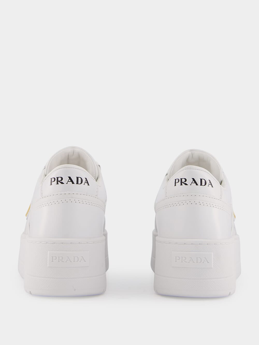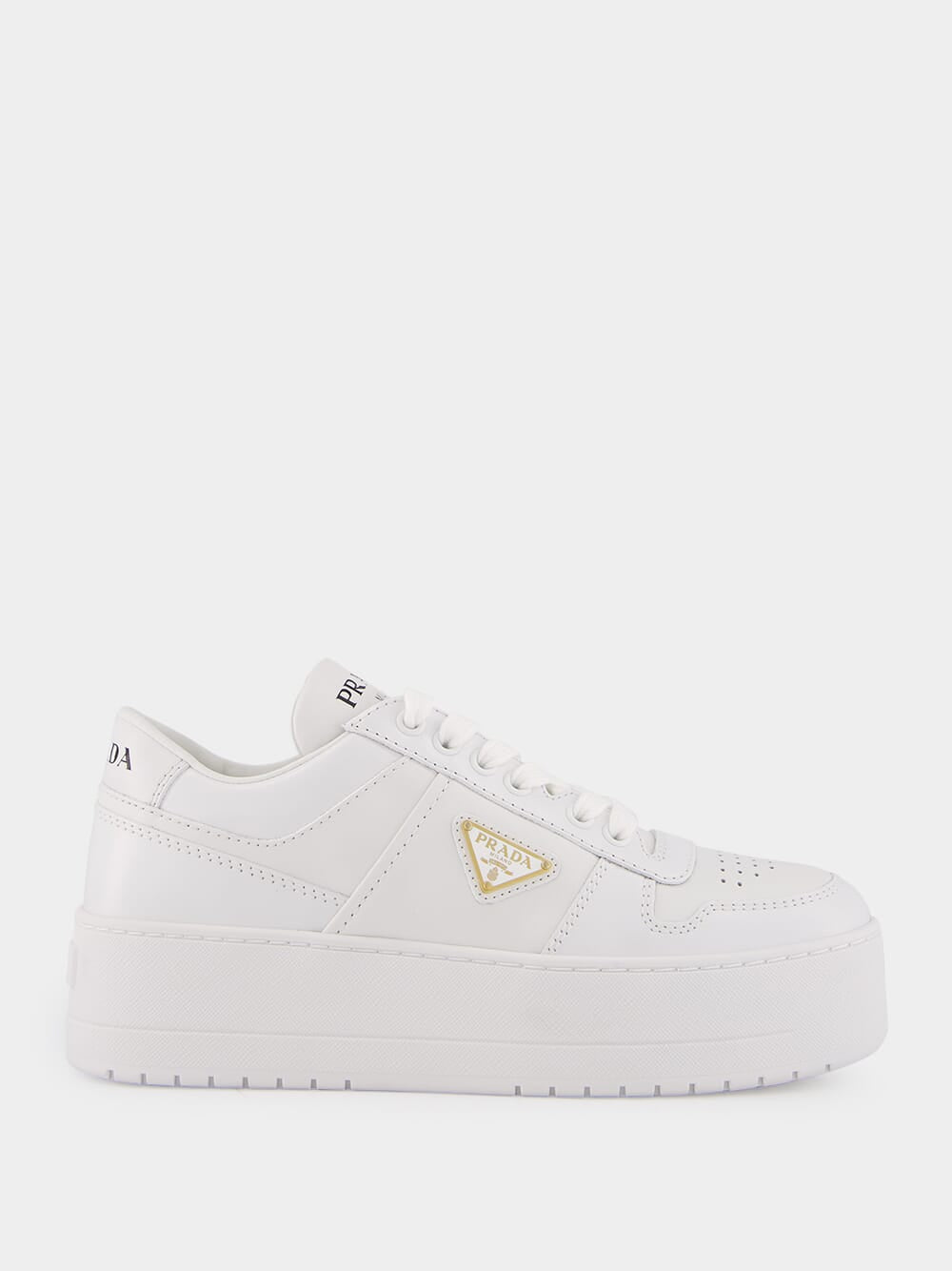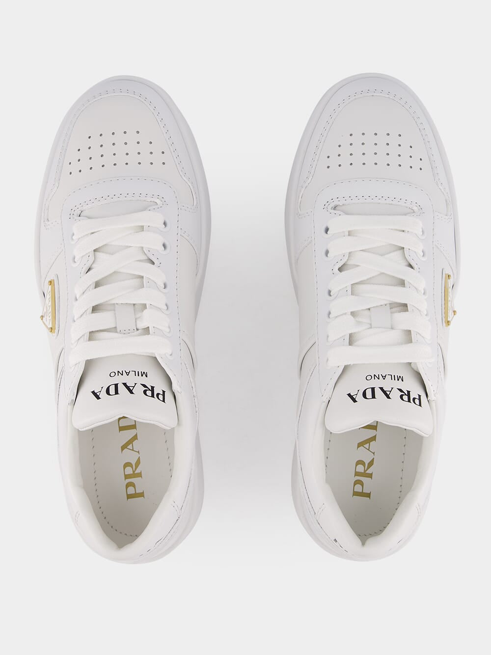 Inspired by basketball sneakers of the '80s, these Downtown Bold sneakers have a sporty design with refined details. Made of perforated leather, they feature flatform soles that give a distinctive, contemporary character. Prada logos decorate the shoe, completed with the enameled metal triangle.