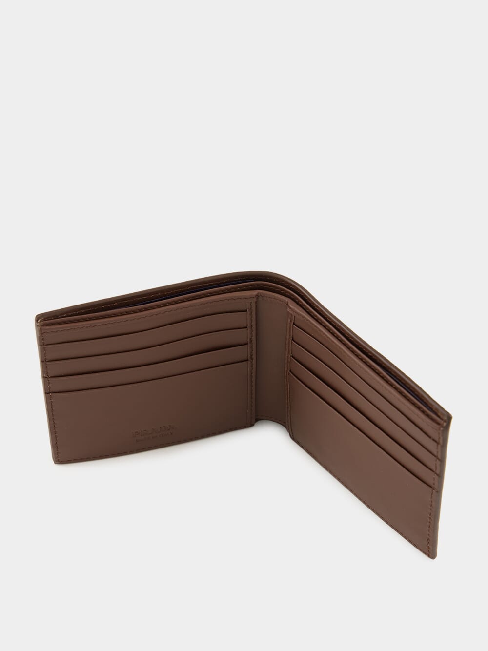 The Sienna Brown Leather Wallet by Prada offers timeless refinement in a compact, everyday silhouette. Crafted from smooth calfskin with a subtle sheen, this structured wallet opens to reveal eight card slots and two bill compartments, designed for streamlined organization. A moiré and leather lining adds tactile contrast, while the iconic enameled metal triangle logo brings a signature finish. With its clean lines and practical interior, this piece balances luxury with function in classic Prada fashion.