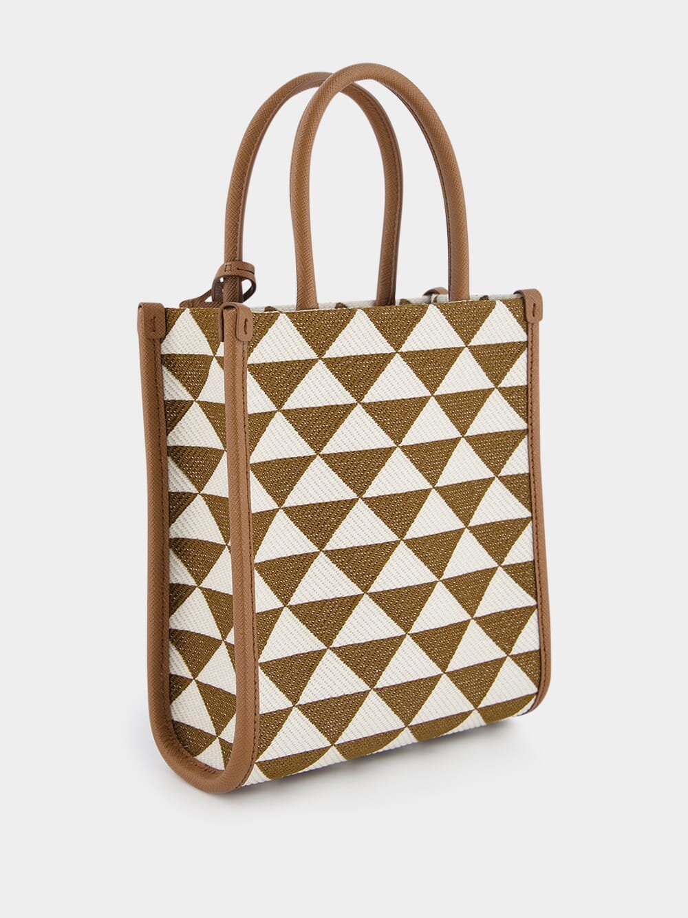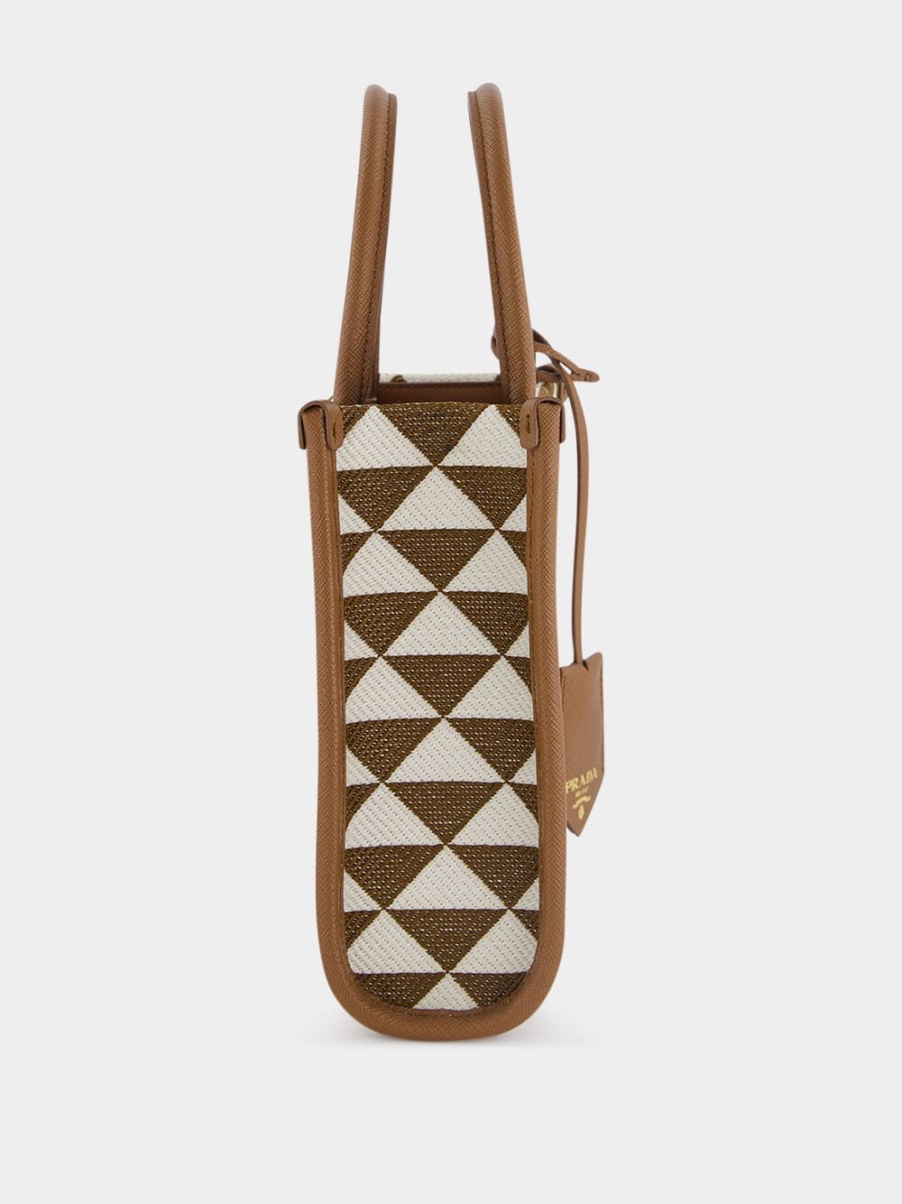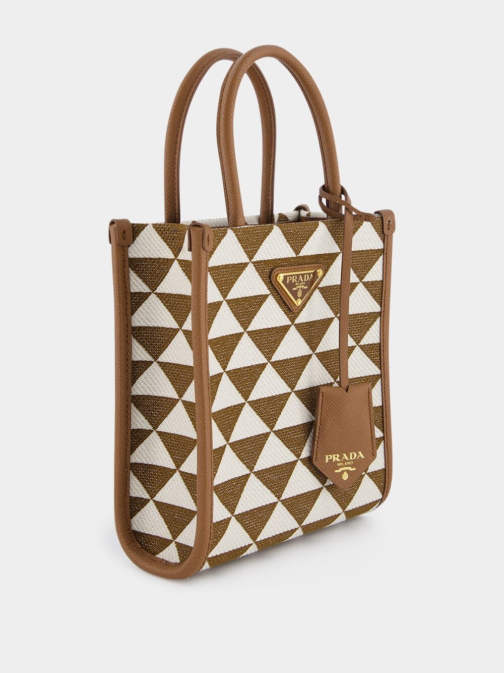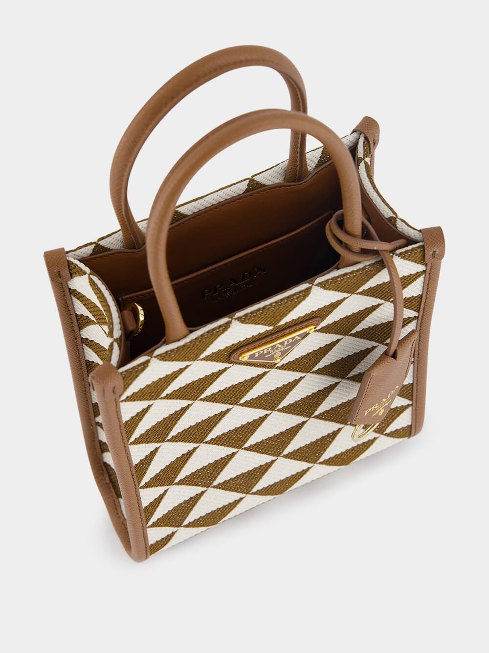 Symbole Embroidered Fabric Mini Bag, a perfect blend of style and functionality. Crafted with exquisite attention to detail, this bag features Saffiano leather details, adding a touch of elegance to its design. The Saffiano leather handles ensure a comfortable grip, while the detachable and adjustable 110 cm Saffiano leather shoulder strap offers versatile carrying options. The bag comes with a removable leather keychain, adding a personalized touch. With its metal hardware and enameled metal triangle logo on the front, this bag exudes sophistication. Inside, you'll find the iconic Prada logo-print nylon lining, accompanied by a convenient patch pocket.