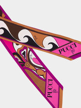 This stunning silk twill scarf features the iconic Orchidee print, with a dynamic combination of swirling waves and psychedelic patterns. The slim design is accentuated by Pucci's signature logo and an intricate intertwined fish motif, adding a touch of luxury. Crafted from high-quality silk, the vibrant color palette of white, fuchsia pink, chocolate brown, and dark brown creates a striking visual. Please note, each scarf is unique, as the all-over print may vary slightly, ensuring no two pieces are exactly alike.