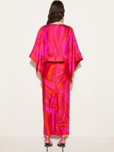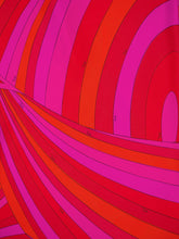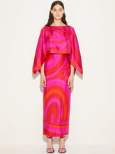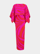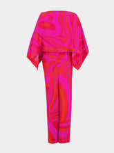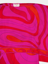 This elegant Pucci silk dress features the Iris and Marble prints in vibrant fuchsia, orange, and red tones. Crafted from silk twill, it showcases a straight silhouette, a boat neckline, draped sleeves, and a wide, layerable top for added drama.