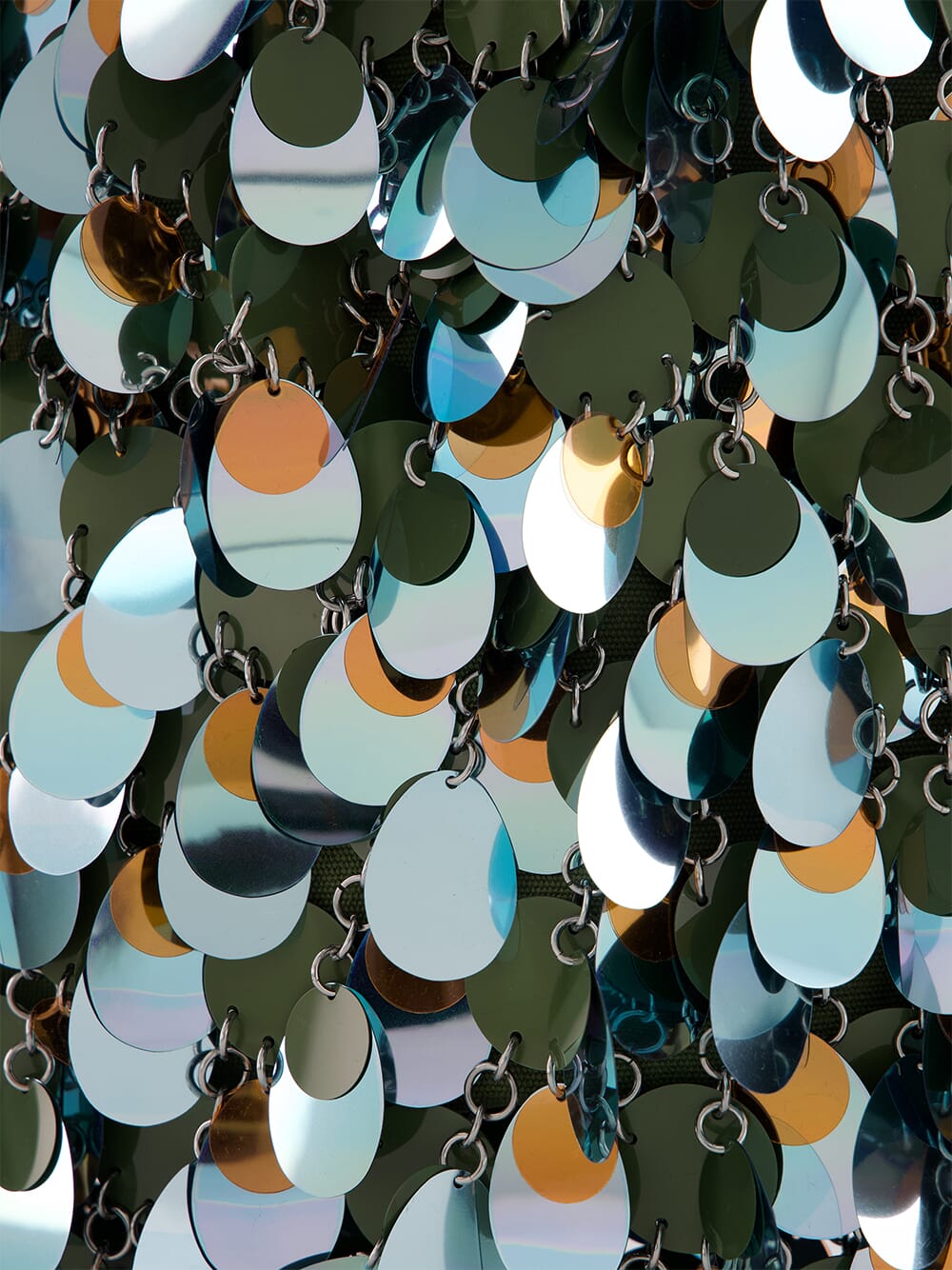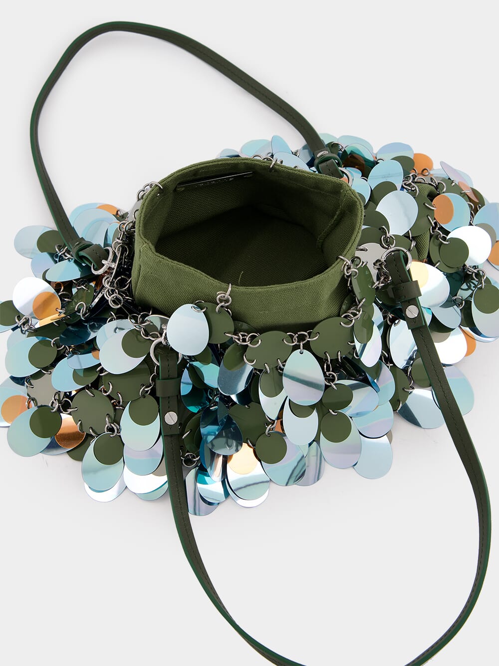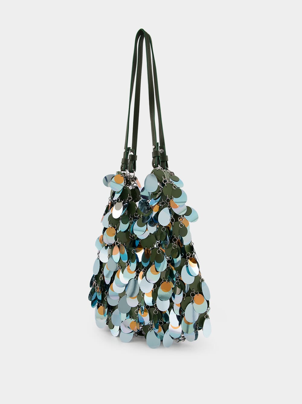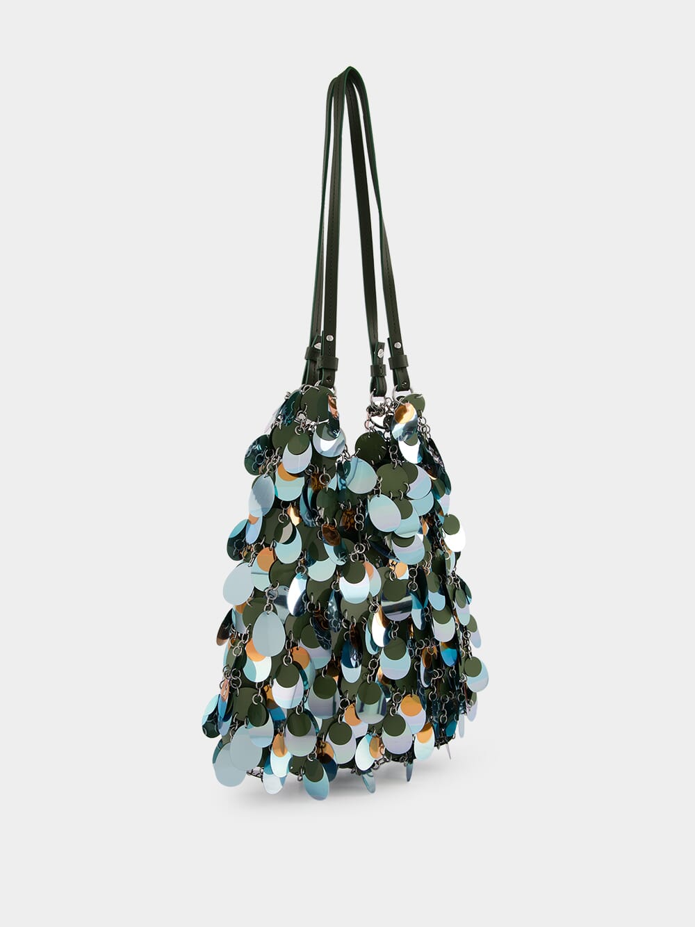 This green/blue sequined shoulder bag features a captivating sequin design, perfect for adding a touch of sparkle to any outfit. It comes with two adjustable shoulder straps for a customizable fit, a spacious main compartment, and a logo plaque. The silver-tone hardware complements the open top design, making it ideal for both casual and evening occasions.