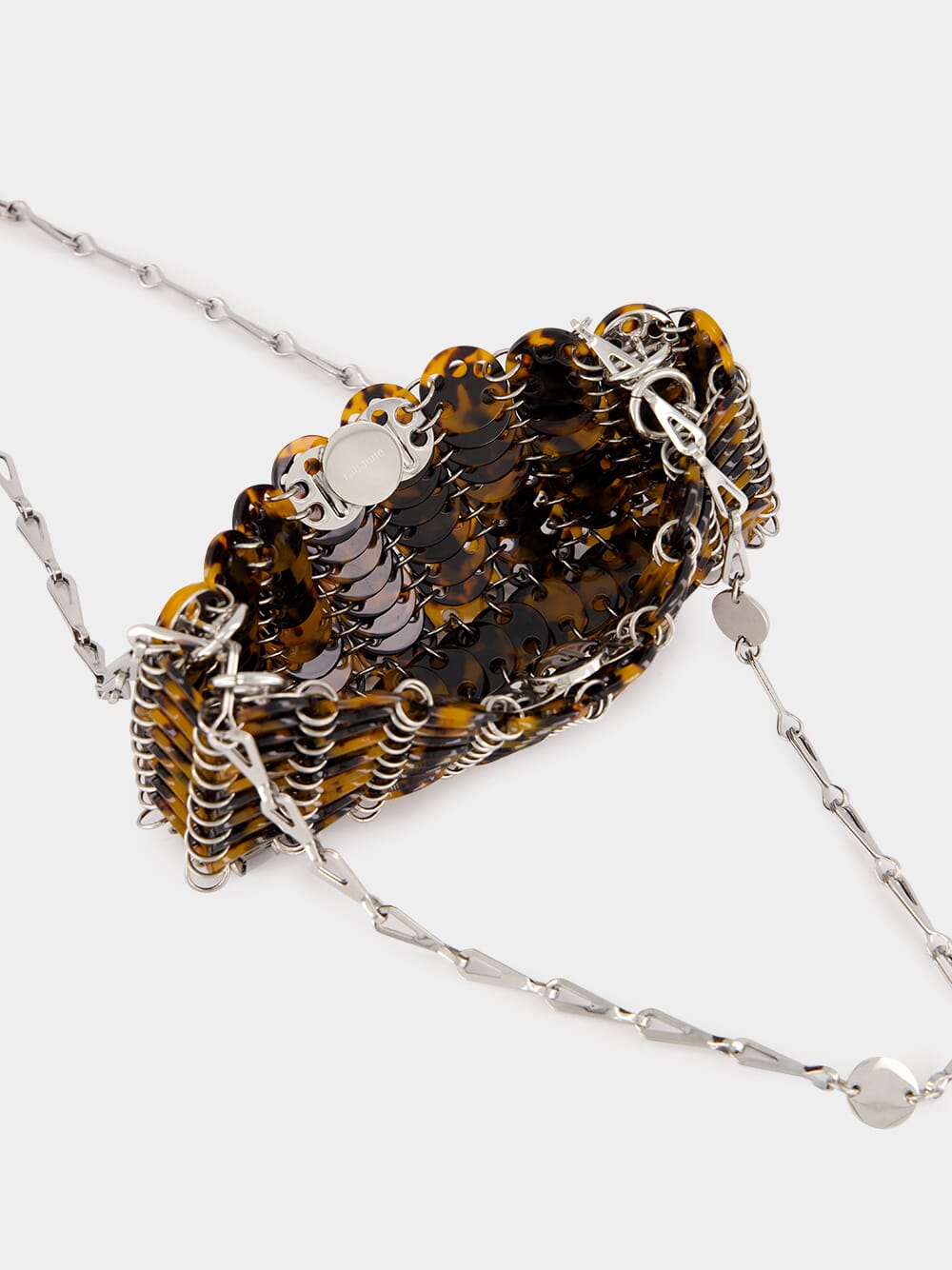 The 1969 Nano Tartaruga bag is handcrafted from 157 tortoiseshell-effect acrylic resin discs, creating a unique and eye-catching design. This versatile bag can be worn as a hand-carry, over the shoulder, or crossbody. The intricate assembly and compact size make it a standout accessory for both day and evening wear.