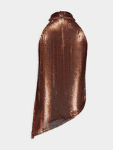 This halter top is a true fusion of innovation and style, constructed from 100% aluminium mesh for a striking metallic appearance. The material grants a unique texture and sheen, capturing the essence of modern glamour. Ideal for those who dare to stand out.