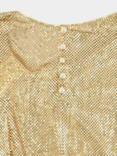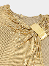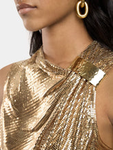 This elegant sleeveless top features a striking asymmetrical drape in gold mini mesh, creating a luxurious and shimmering effect. The piece is adorned with a gold jewel on the shoulder, enhancing its glamorous appeal. The soft draping adds movement and sophistication, making it perfect for evening events or special occasions. Its sleek silhouette and eye-catching design make it a statement piece, ideal for those who appreciate a refined, high-fashion aesthetic.