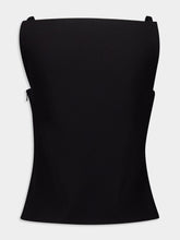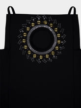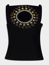 This luxurious black wool sleeveless top features a striking rhinestone embellishment surrounding a circular cut-out on the chest, creating a bold, glamorous look. With a square neckline and pleat detailing, the structured panelled design adds sophistication to this piece. The raw-cut edges enhance its modern appeal, while the side zip fastening ensures a smooth fit. Fully lined for comfort, this top is perfect for evening occasions or upscale events, offering a unique, high-fashion aesthetic.