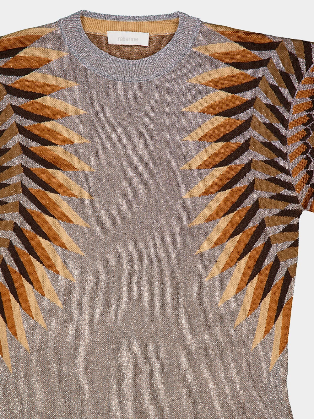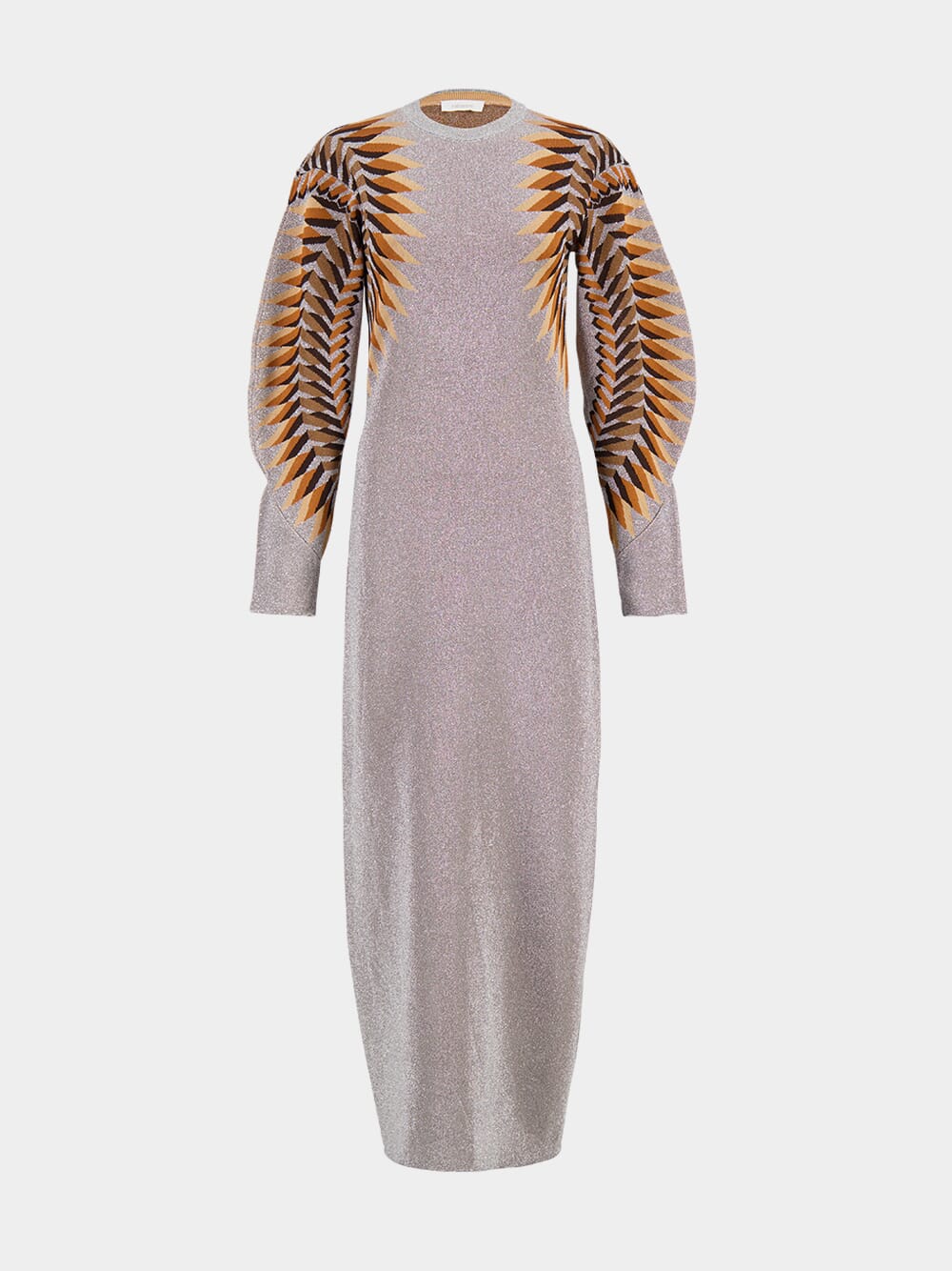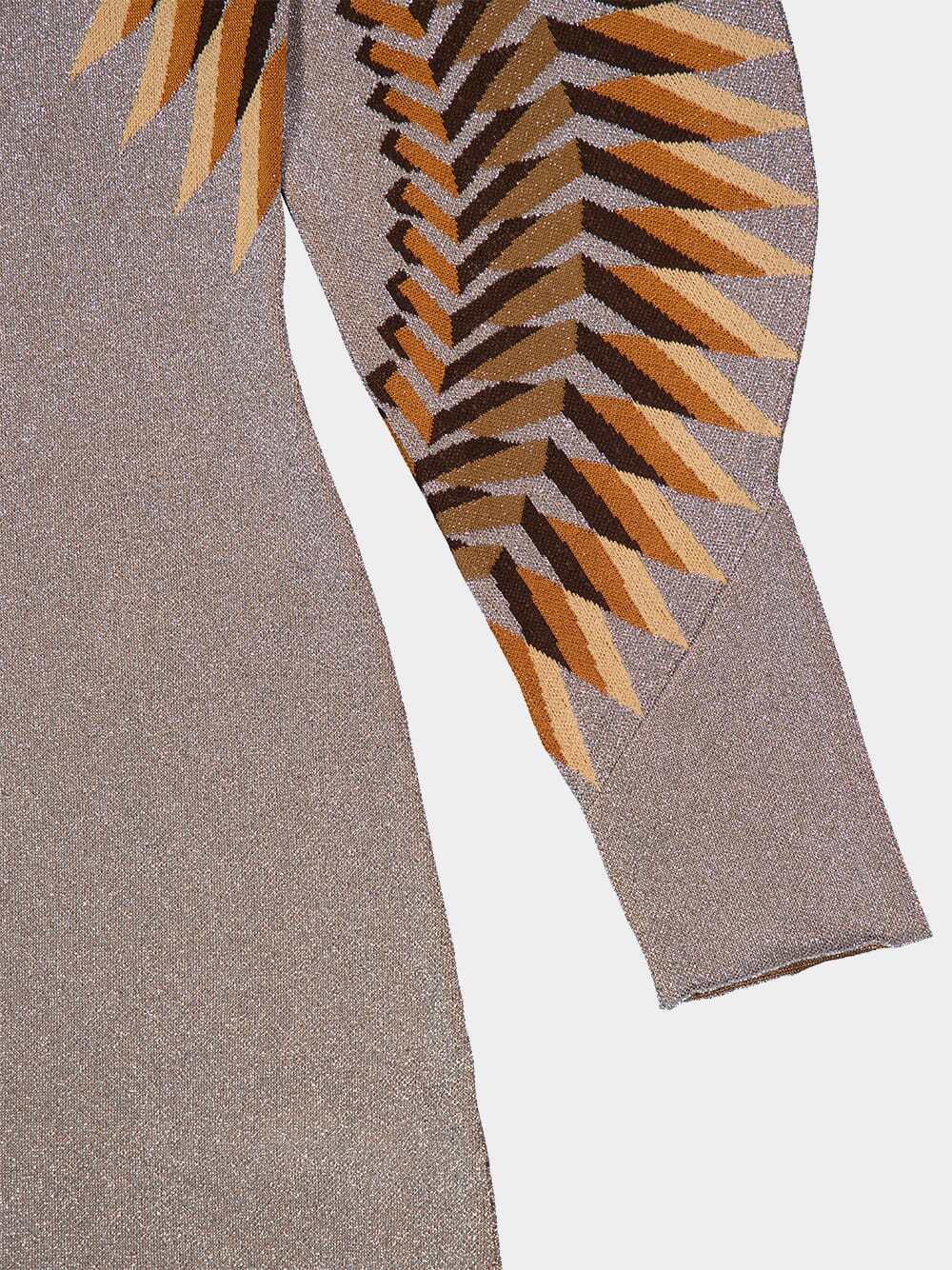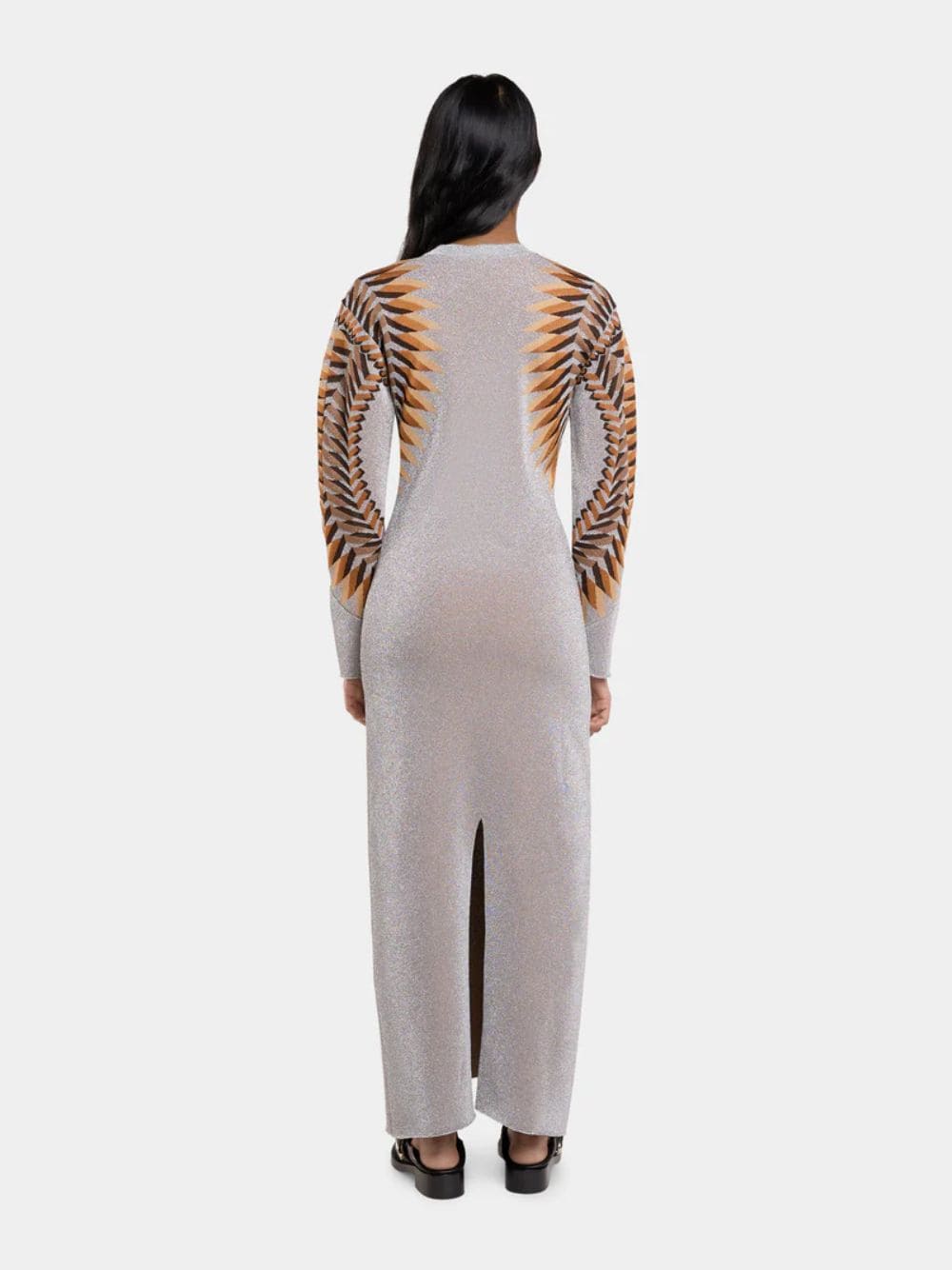 This silver long lurex jacquard dress features a striking design with brown accents. Crafted from viscose lurex, it has a crew neck and long rounded sleeves for an elegant silhouette. The ankle-length style includes two side slits for added movement, making it suitable for both formal and evening occasions.