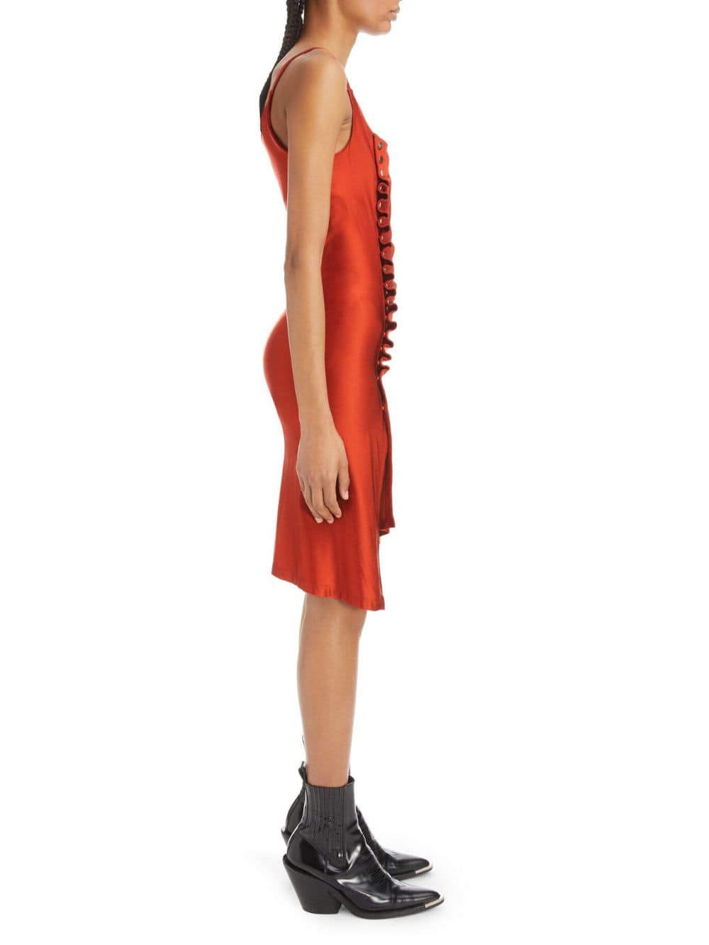 Draped satin dress, a show-stopping piece that exudes effortless style. Crafted with a stretch-design, this dress offers a comfortable and flattering fit. The exquisite draped detailing adds a touch of elegance, while the silver-tone stud detailing brings a hint of edgy sophistication. With a classic scoop neck and sleeveless design, this dress is perfect for both daytime and evening occasions.