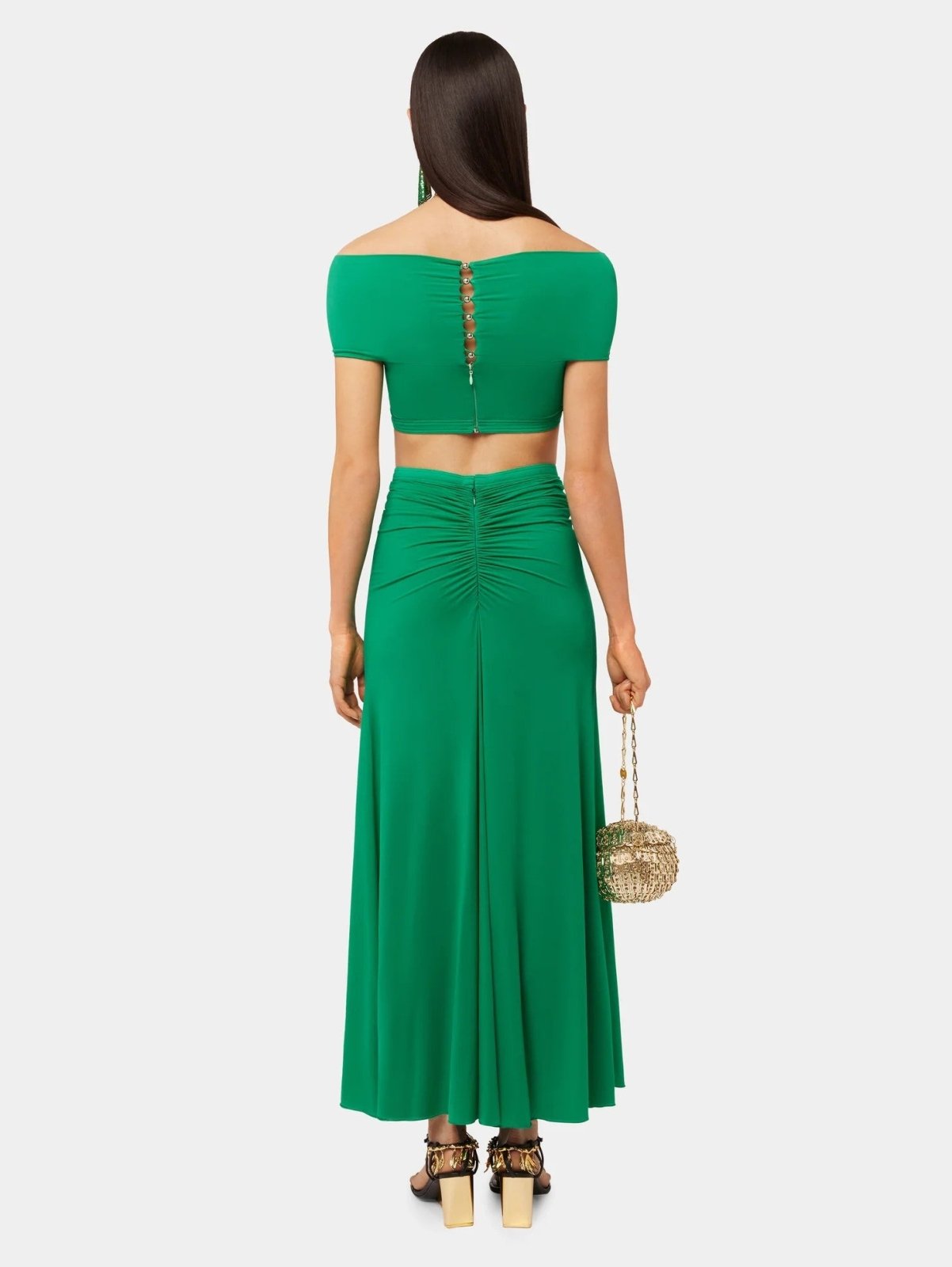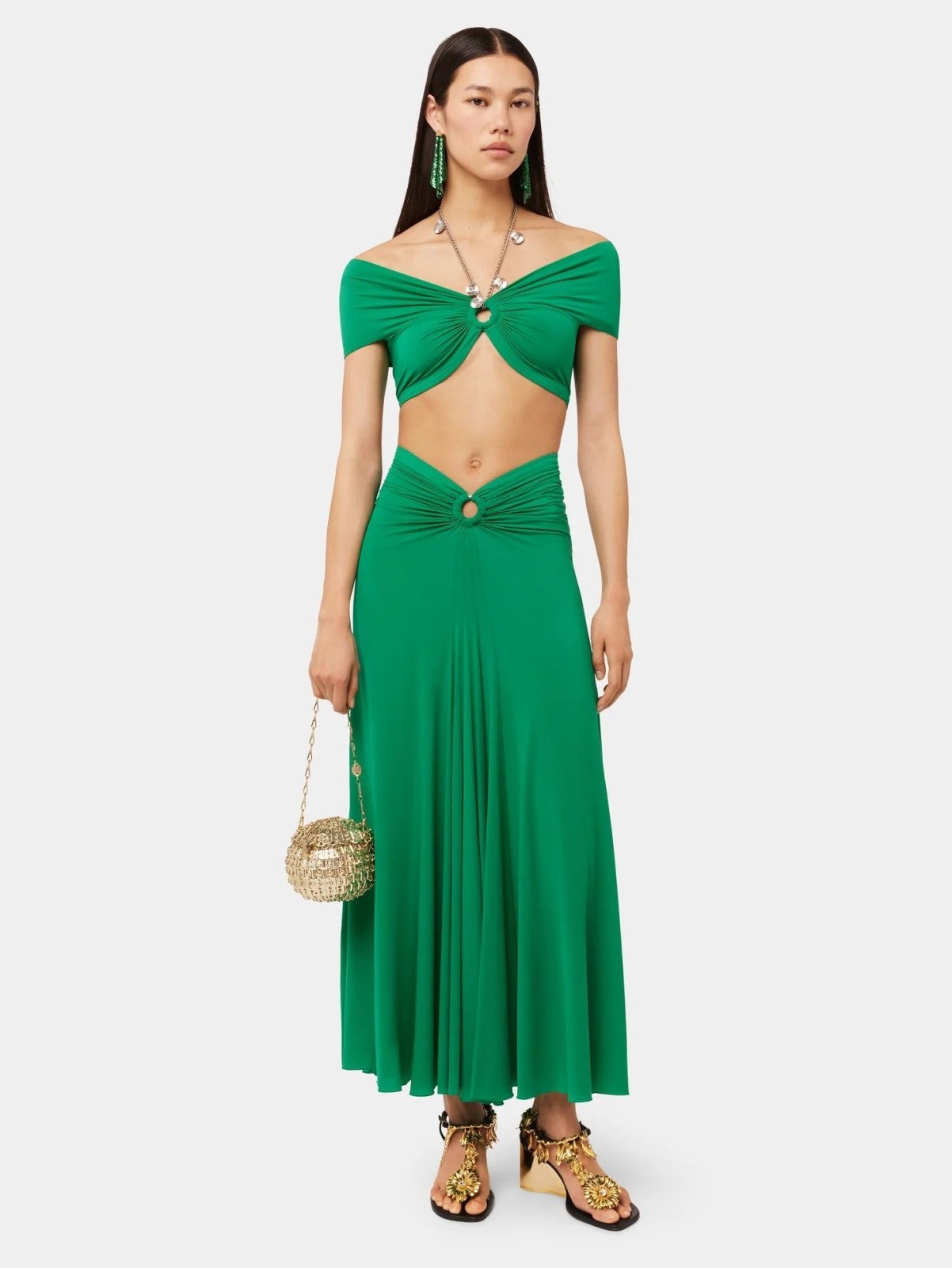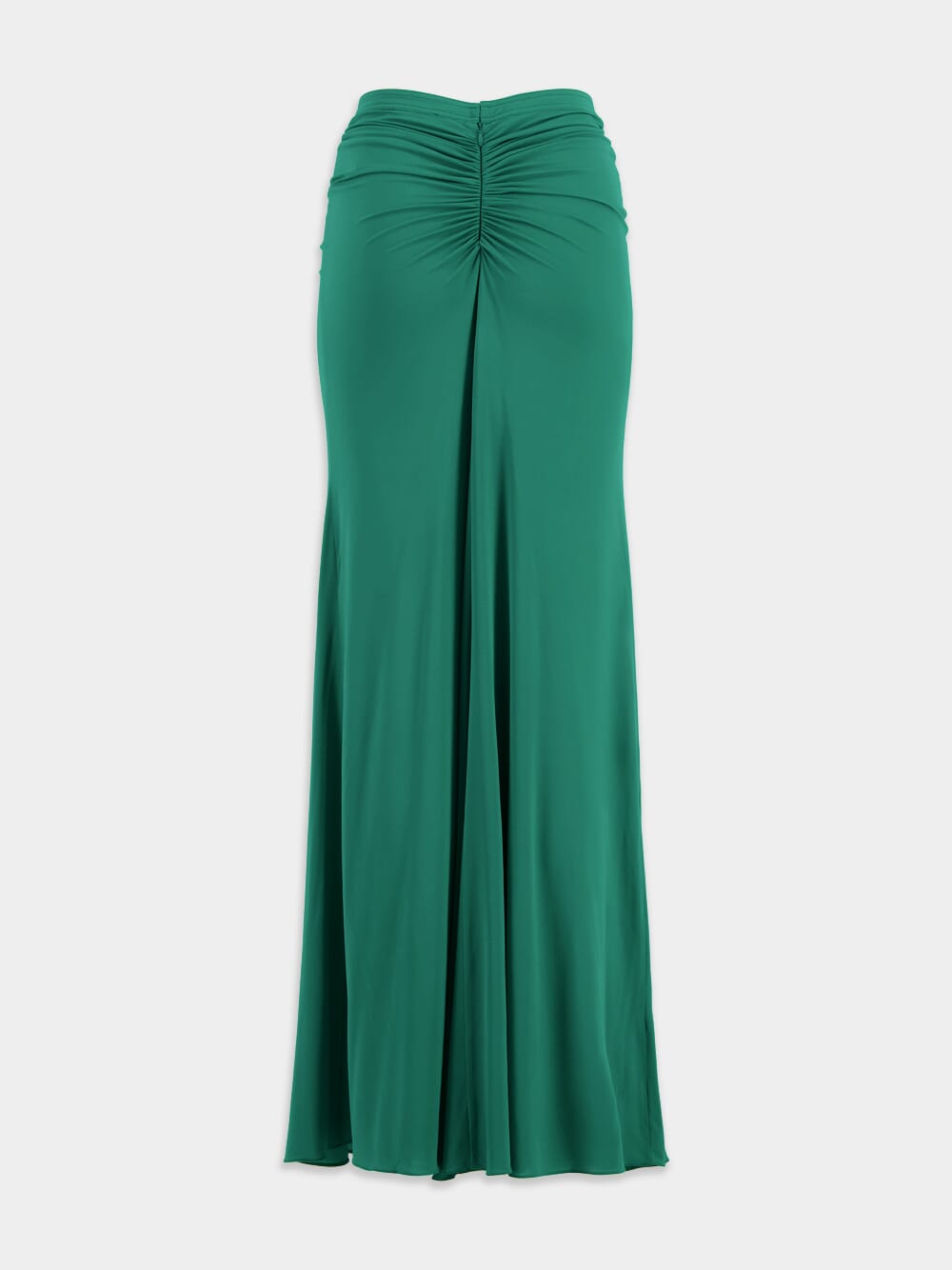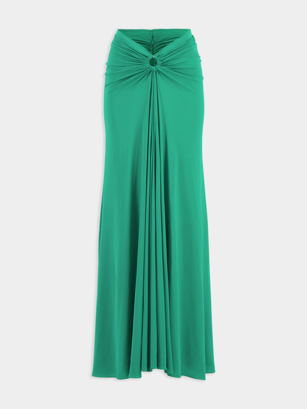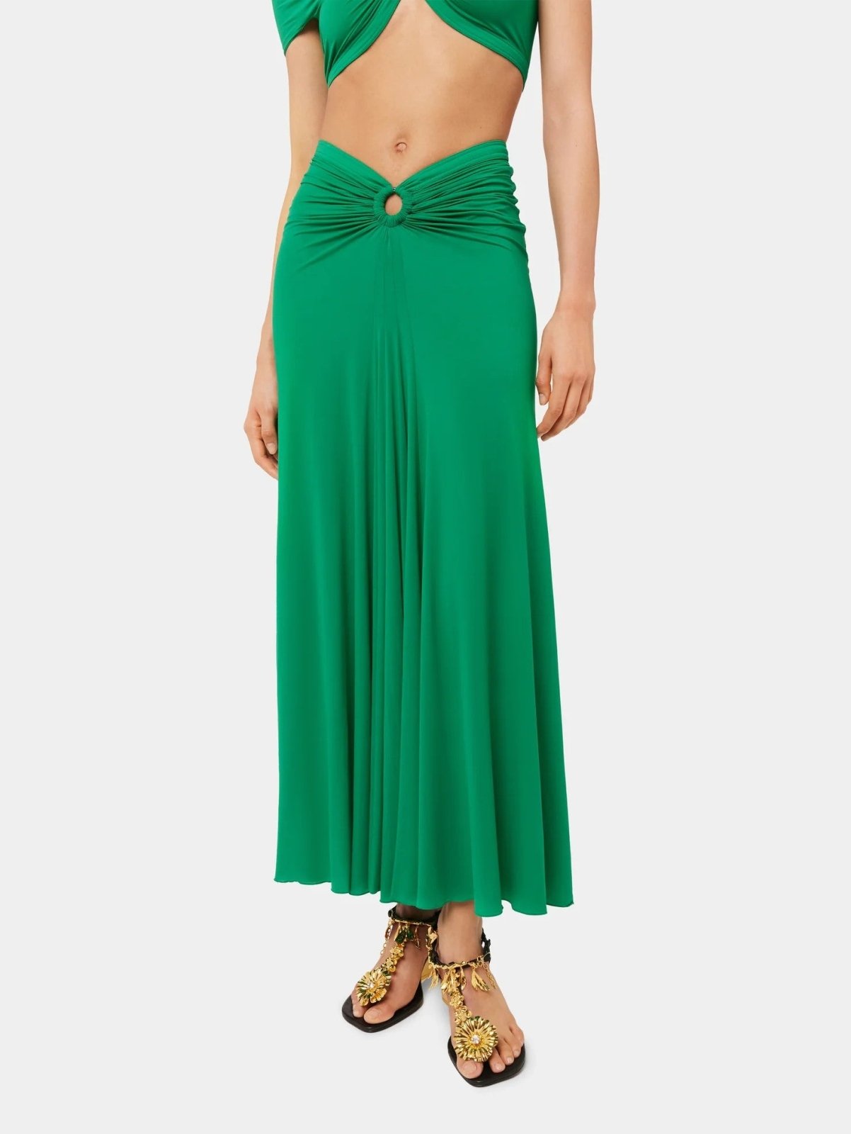 Gathered-detail midi skirt, features exquisite gathered detailing, adding texture and dimension to your look. The stylish ring hardware detailing adds a touch of modern flair, elevating the overall design. Crafted with precision and attention to detail, this midi skirt offers a flattering silhouette that effortlessly flares at the hemline. Perfect for both casual and formal occasions