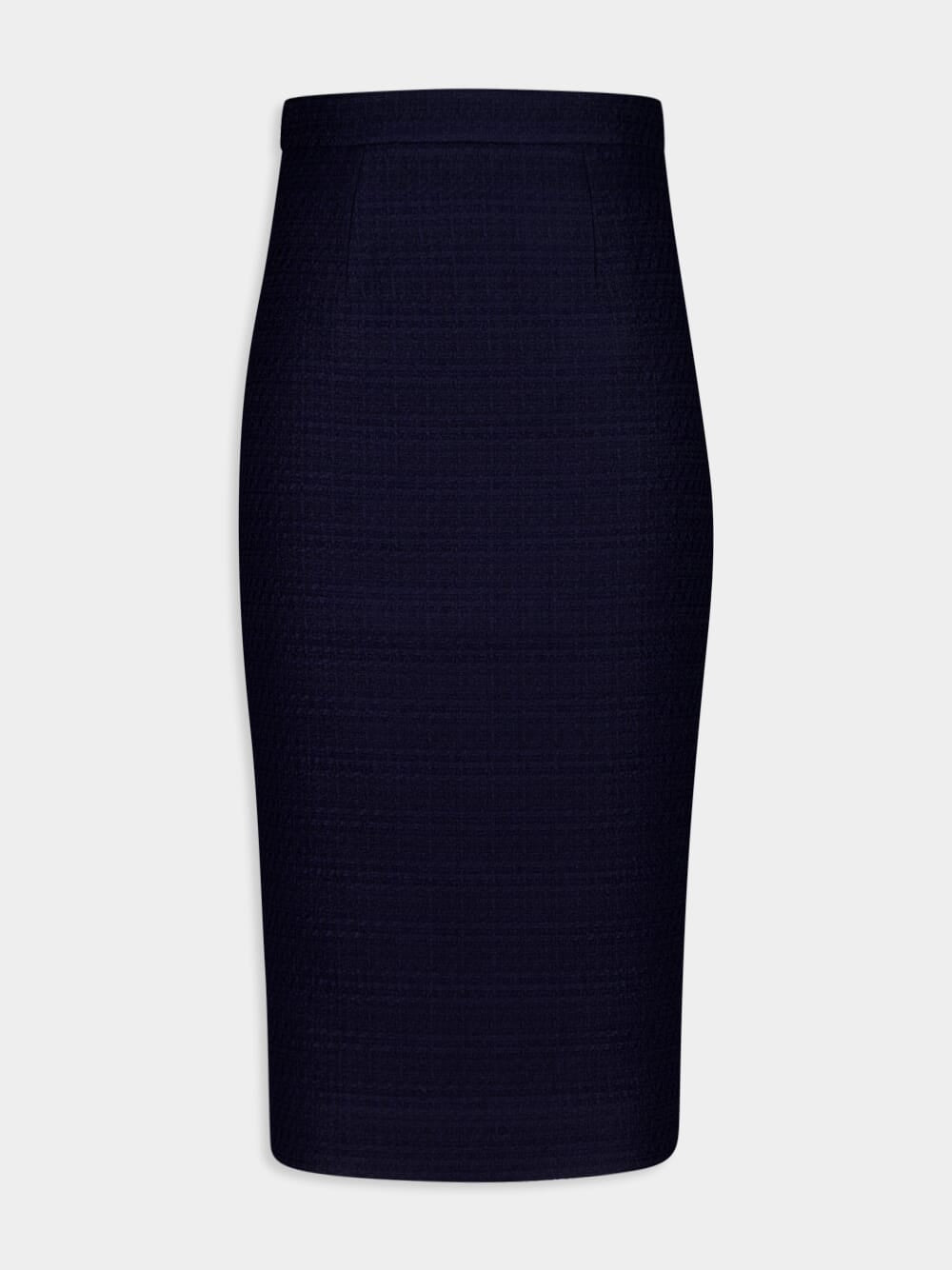 This tailored short-sleeve top in deep navy bouclé showcases refined structure with a modern edge. Featuring an asymmetrical twist neckline and softly draped belted peplum, it creates a flattering, feminine silhouette. Fully lined for comfort, it includes removable shoulder pads, a fabric belt, and an exposed back zip. Perfectly paired with its matching skirt or styled separately for versatile sophistication.