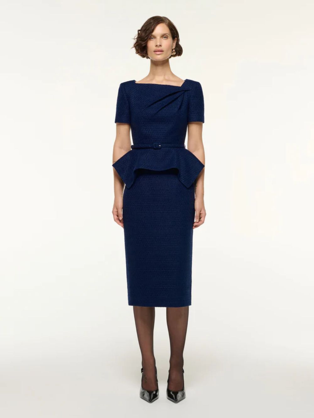 This navy column midi skirt is crafted from a rich bouclé fabric, offering a refined texture and sleek silhouette. Fully lined for a smooth fit, it features an exposed zip fastening at the back for a contemporary touch. Designed to pair effortlessly with its matching top or as a standalone statement piece, it embodies polished elegance with modern versatility.