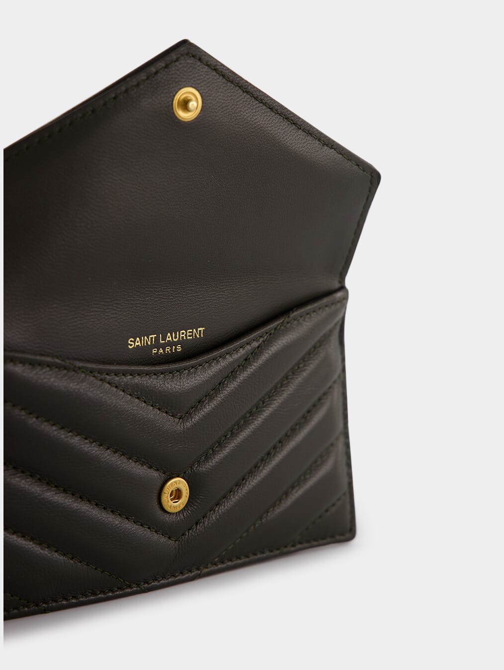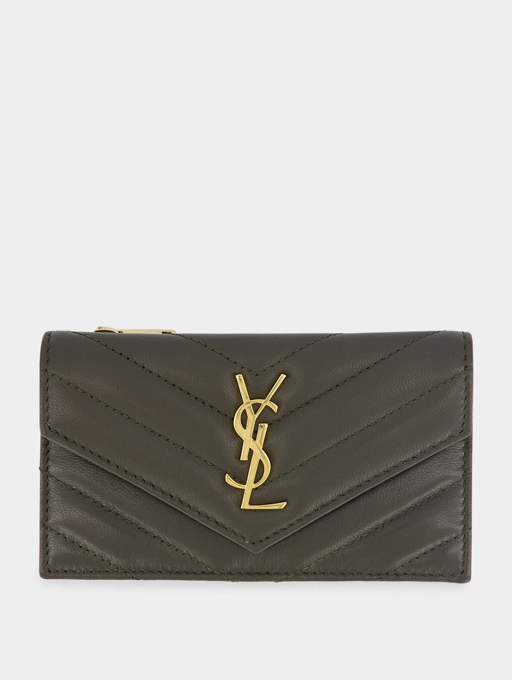 Cassandre Matelassé Cardholder, featuring a convenient snap-button closure for security and style. The exterior boasts a zip coin pocket and five card slots for organization and easy access. Inside, you'll find a spacious main compartment with elegant grosgrain lining, complemented by gold-toned hardware for a touch of luxury.