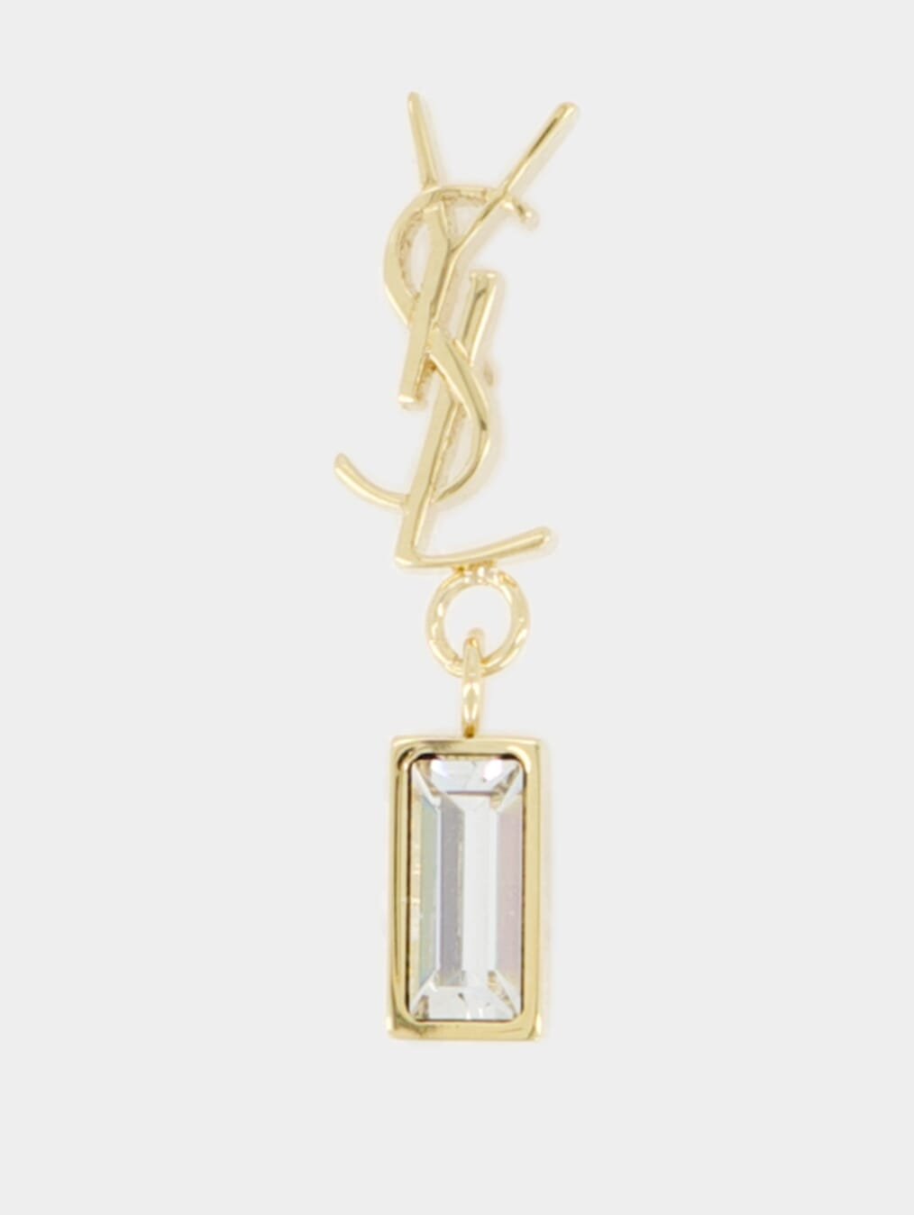 Cassandre single earring in metal and rhinestones, a stunning statement piece adorned with the iconic Cassandre logo and a dazzling baguette rhinestone pendant. Designed for pierced ears, it features a secure post closure for easy wear. The earring is elegantly engraved with "SAINT LAURENT PARIS," adding a touch of luxury to your ensemble.