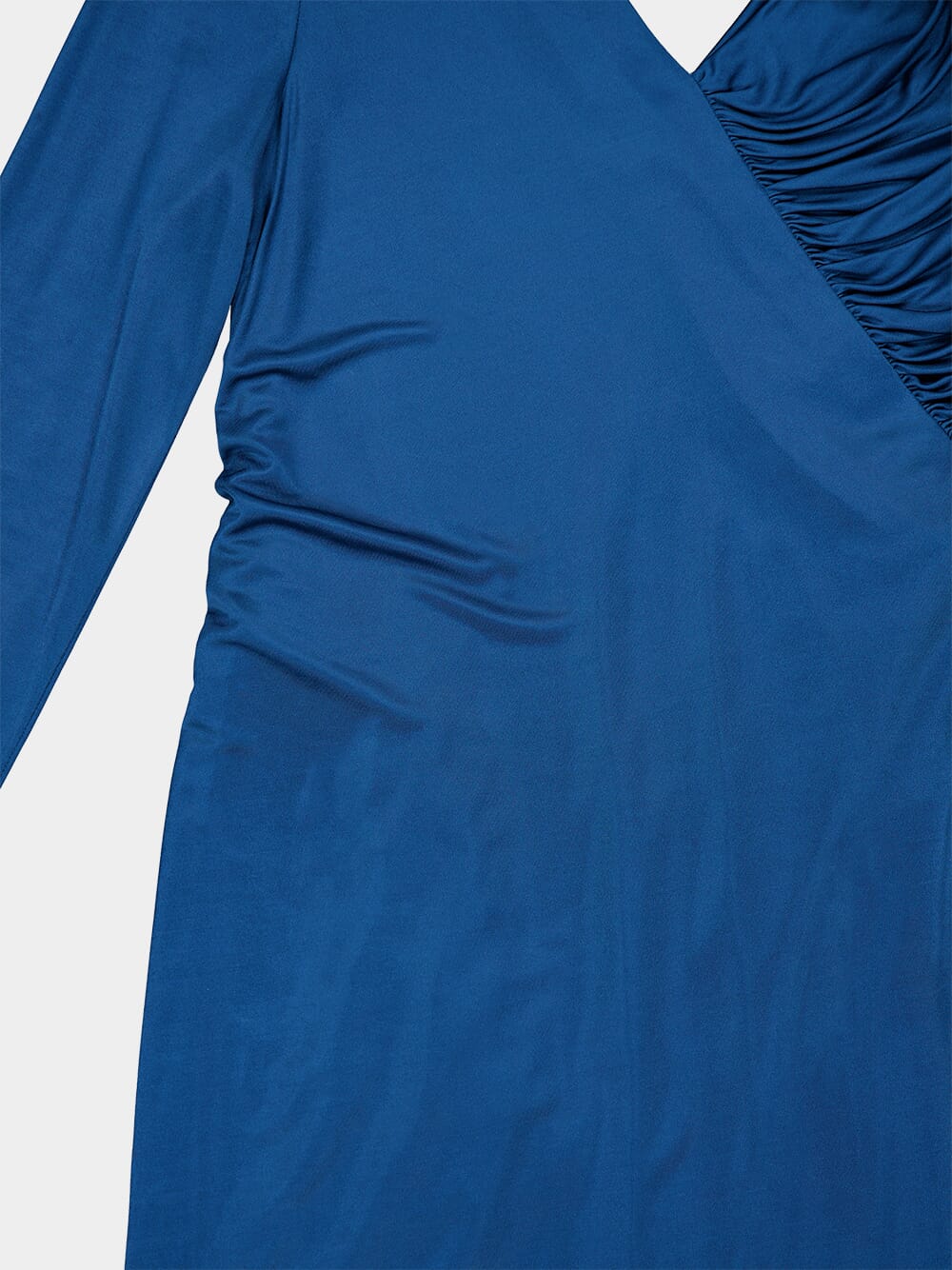 This short dress is crafted from shiny viscose jersey, featuring elegant draping for a sophisticated look. The V-neck and long sleeves enhance its stylish appeal, making it perfect for a chic evening out.